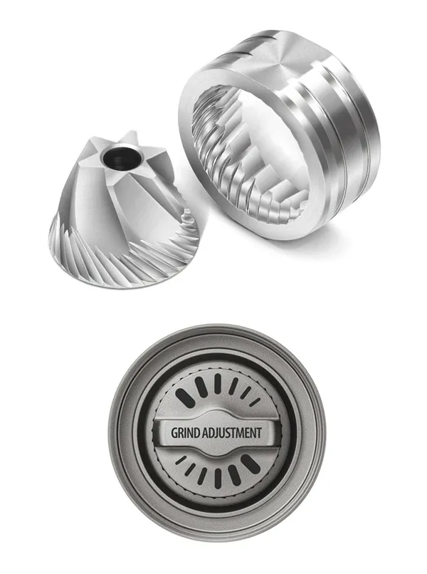 Its aluminum unibody frame and internal structure are machine-milled with a very low tolerance for a perfect burrs alignment and minimal clearance. As a result, the grind has an impressive uniformity for a well-balanced coffee flavor. Mounted on a stainless-steel center shaft with dual bearings the handle rotation produces minimum friction for a smooth and easy grinding experience even at the finest espresso setting. The grinder body is covered with a silicone sleeve for a better and more comfortable grip.