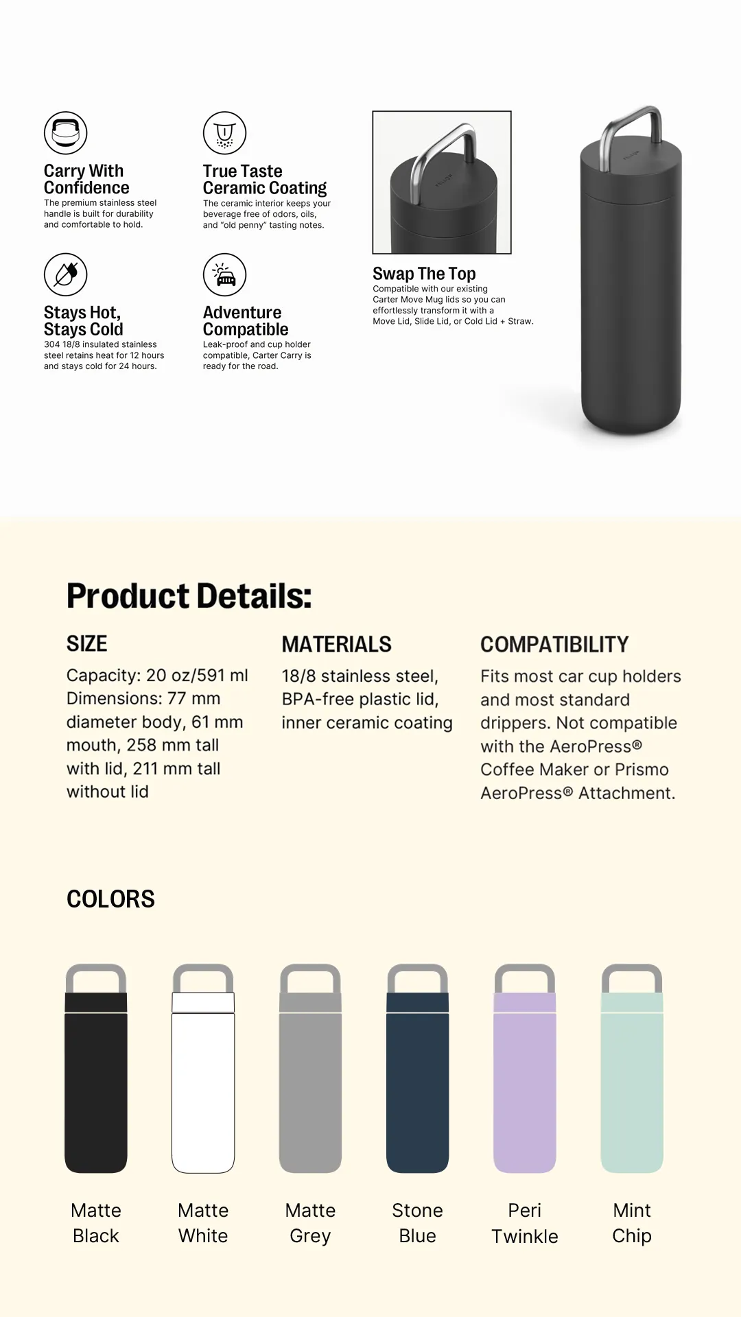 This mug wears many hats. Lock in 20 oz of heat, flavor, and style with Carter Carry, an elegant insulated tumbler with a premium metal handle that’s both easy to carry and easy on the eyes. Enjoy the same award-winning features as our Car ter Move Mug—True Taste ceramic coating, snap-in splash guard, and a thin, drinkable lip—for an uncompromised sipping experience, in an uncompromising size.