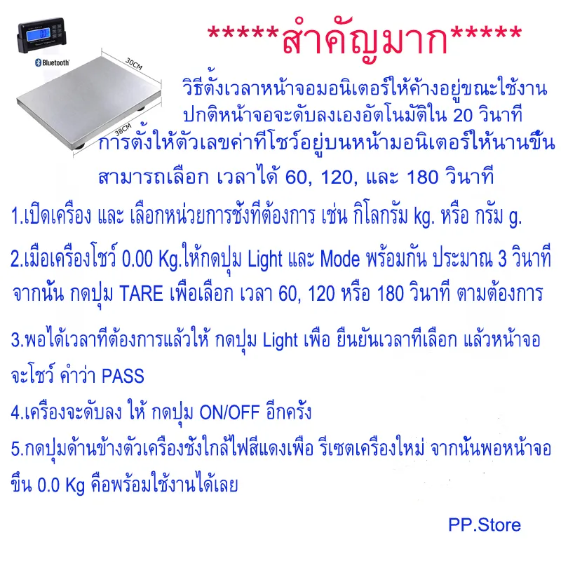 • น้ำหนักได้ 3 โหมด คือกิโลกรัม(Kg.) ปอนด์(Ld.) ออนซ์(Oz.)