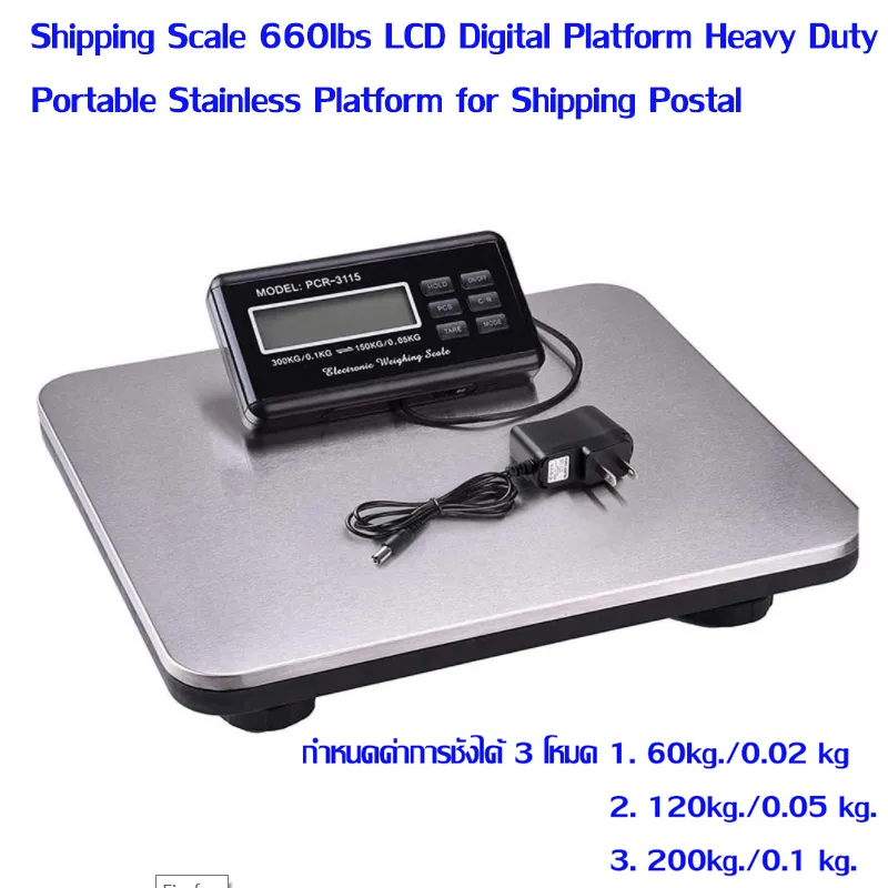 • Product descriptionThe heavy-duty digital shipping and postal scale has an impressive 200kg (441lbs) max weight capacity. The weighing platform is made entirely out of heavy duty stainless steel, ensuring exceptional durability even under harsh conditions. The wired external LCD backlit display provides clear and accurate readings. Suitable for both commercial and home use, ideal for post office, food industry, electronics, mines, medical industry, agriculture and textiles, etc.Display functions:”MODE”:Press to switch between units. (kg/oz/lb)”C/R”:Press to switch between weight class”TARE”:Press to set the empty container weight to zero, so the scale only shows the weight of the material that is later added in the container.Specification:
