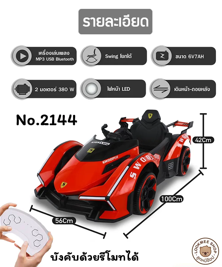 รายละเอียด รุ่น2141 2มอเตอร์ ขนาด : กว้าง 48cm. ยาว 90cm. สูง 40cm. ขนาดแบตเตอรี่ 12V4.5AH ไฟหน้า LED 2มอเตอร์ใหญ่ 380w มีเครื่องเล่นเพลง MP3 USB มีระบบมอเตอร์โยกสวิง เพลินๆ สามารถบังคับทางไกลผ่านรีโมทหรือมือถือได้ ฟรีสายชาร์จแบตเตอรี่