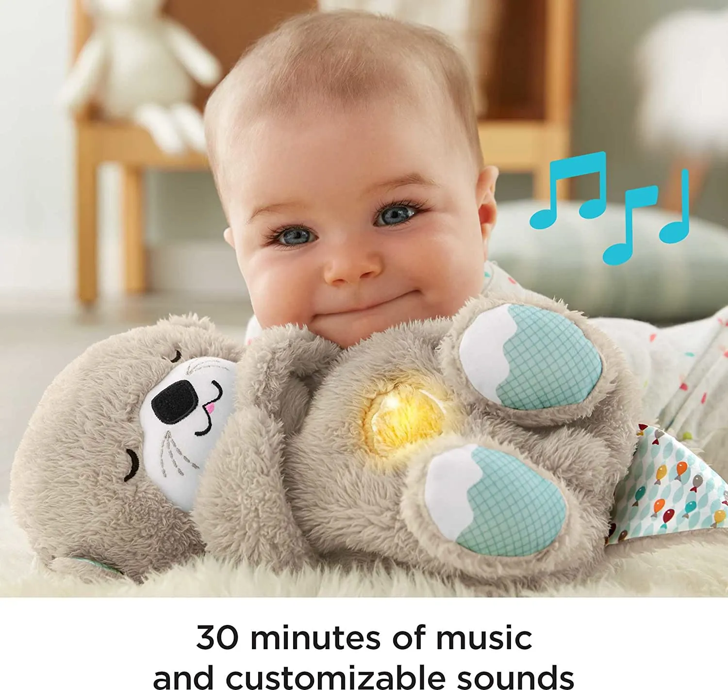 Musical otter plush sound machine with “breathing” motion for babies from birth +