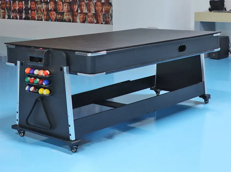 4 in 1 pool table with built-in Pool, hockey table and table tennis table and a multi-purpose table. May it be strong, beautiful and durable. to be placed in the living room or relaxation room ● Vibrating compressors can do this while not in use. ● Material: E2 MDF + PVC Laminate. ● Working area size: 70.5 x 162 cm. ● Thickness of active area : 15 mm. ● Table size: W*L*H = 110x210x82 cm. There are 4 tables in one. It is convenient to use and change the activities you keep longer.