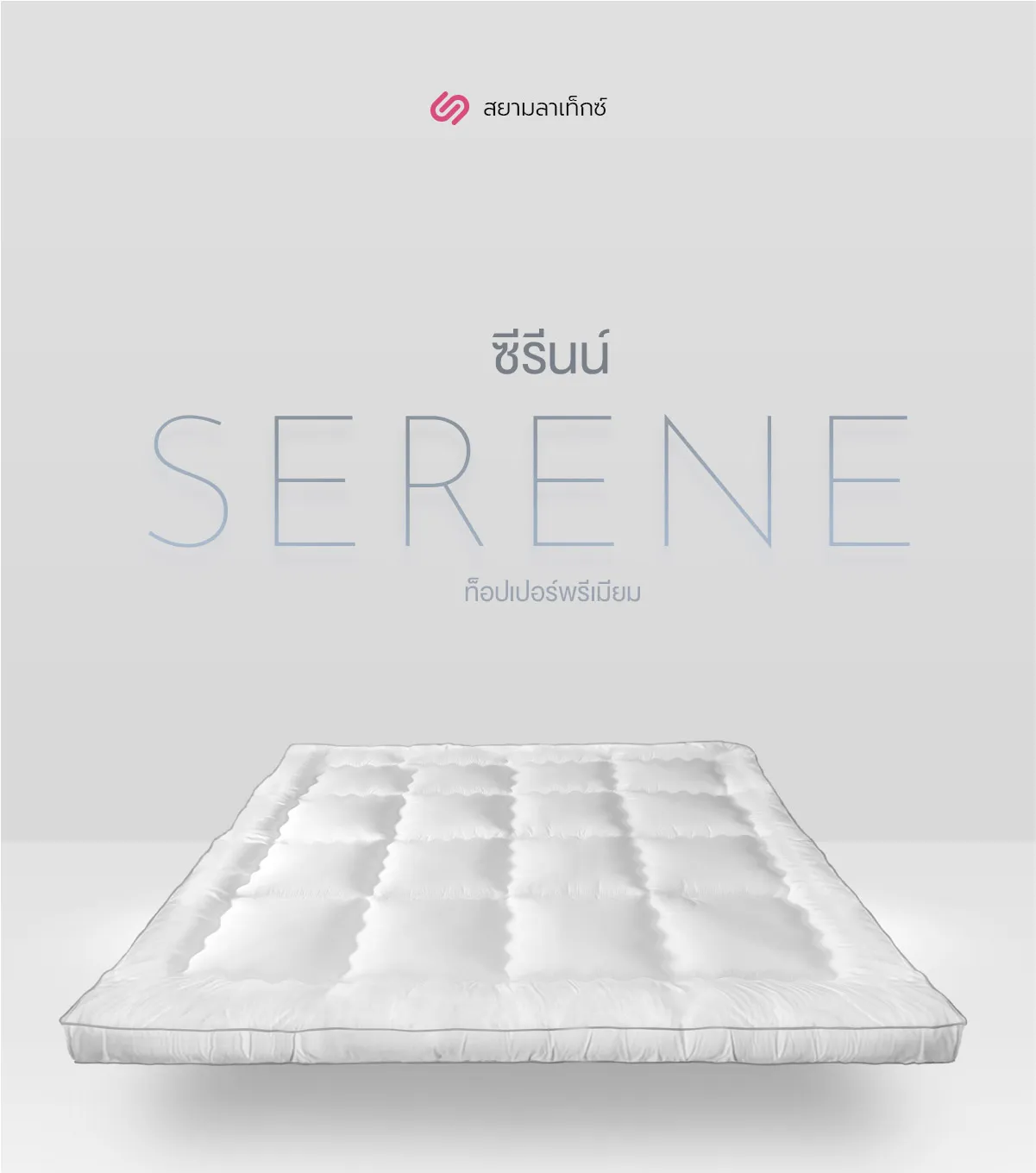 Siamlatex ท็อปเปอร์ขนห่านเทียม รุ่น Serene หนา 4 นิ้ว ที่สุดของความนุ่ม นอนสบายกว่าที่เคย รองรับสรีระและซัพพอร์ทกระดูกสันหลังได้อย่างดีเยี่ยม มาพร้อมนวัติกรรมAnti-Mite ช่วยลดการสะสมของไรฝุ่น เชื้อโรค แบคทีเรีย ปลอดภัย นอนสบายทั้งครอบครัว ใช้เสริมบนที่นอนก็ยิ่งฟินน์เข้าไปใหญ่ อีกขั้นของการนอนหลับที่ดีที่สุด