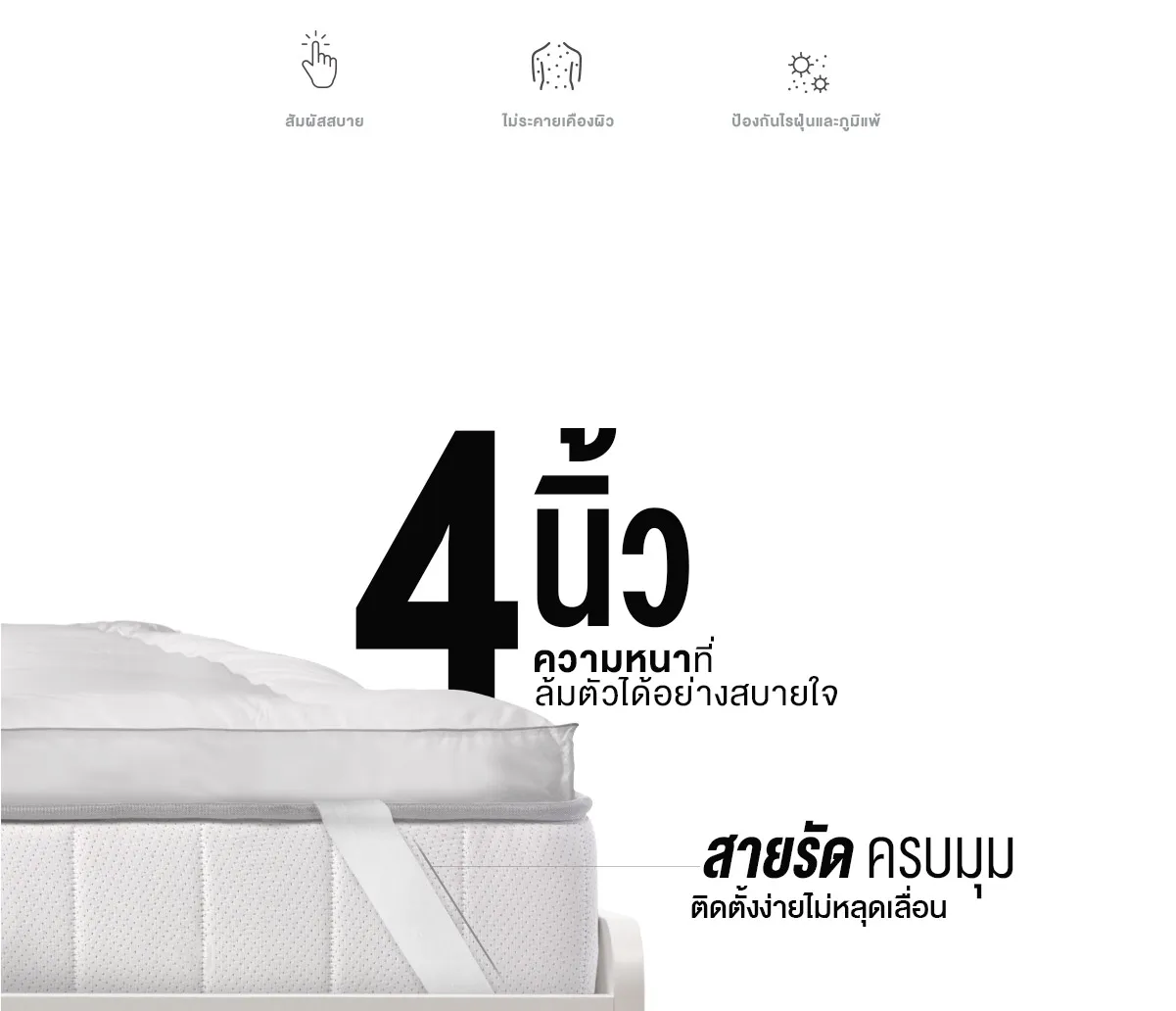 - ป้องกันคุณและคนที่คุณรัก ด้วย นวัติกรรมแอนตี้ไมท์ (Anti-Mite) ลดการสะสมของไรฝุ่น เพิ่มพื้นที่ปลอดภัยบนเตียงนอนของคุณ หลับง่าย นอนสบาย ไม่คัดจมูก ไม่ส่งผลให้เกิดโรคภูมิแพ้ มั่นใจได้มากถึง 98.99 %
