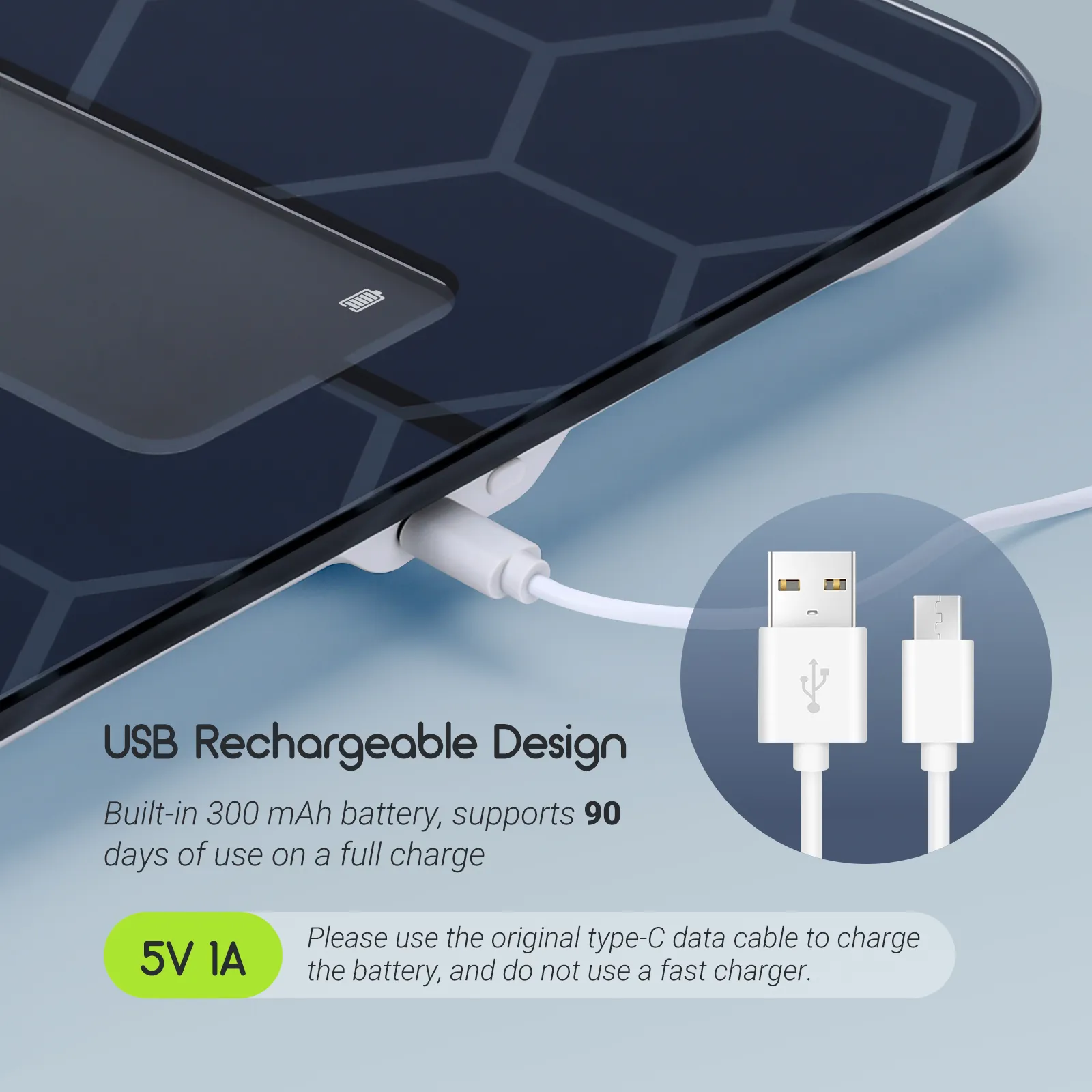 - 【จอแสดงผลขนาดใหญ่พิเศษและชาร์จซ้ำได้】: แตกต่างจากตาชั่งในห้องน้ำอื่นที่แสดงเฉพาะน้ำหนักหน้าจอ VA ที่มีสีสันขนาดใหญ่จะแสดงการวัด8คีย์ของคุณรวมถึงน้ำหนักไขมันในร่างกาย % BMI น้ำ % มวลกล้ามเนื้ออัตราการเต้นของหัวใจมวลกระดูกและประเภทของร่างกาย ช่วยคุณจะได้รับมุมมองที่ชัดเจนเกี่ยวกับตัวชี้วัดร่างกายที่จำเป็นของคุณได้อย่างรวดเร็ว ตาชั่งอัจฉริยะนี้สามารถชาร์จได้ผ่านสายเคเบิลชนิด C แบตเตอรี่ลิเธียมในตัวที่ทนทานสามารถถูกใช้ได้นานหลายปีและเป็นมิตรกับงบประมาณมาก