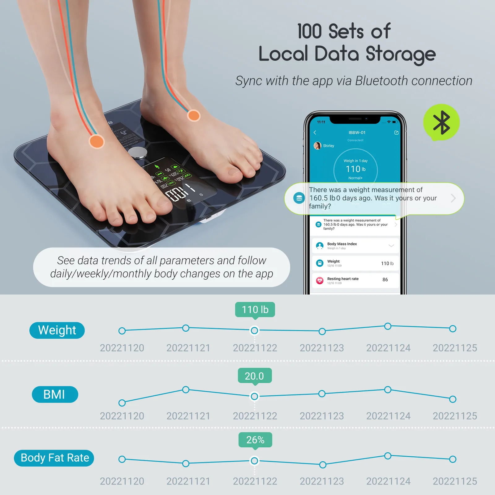 - 【ติดตามการเปลี่ยนแปลงของข้อมูลร่างกาย】-เครื่องชั่งน้ำหนักนี้เหมาะสำหรับผู้ที่พยายามลดน้ำหนักหรือให้ความสำคัญกับสุขภาพในระยะยาว ด้วยการตั้งเป้าหมายและความคืบหน้าในการติดตามผ่านกราฟข้อมูลเพื่อวัดปริมาณข้อมูลต่างๆของร่างกายคุณจึงสามารถดำเนินการได้อย่างเข้มแข็ง แอปหมึกพิมพ์มีกราฟที่ละเอียดและบันทึกข้อมูลในอดีตเพื่อติดตามการเปลี่ยนแปลงในองค์ประกอบของร่างกายในช่วงหลายวันสัปดาห์เดือนและหลายปี เครื่องชั่งน้ำหนักนี้เหมาะสำหรับคุณในการติดตามการลดน้ำหนักและแนะนำให้คุณรักษาไลฟ์สไตล์สุขภาพดีไว้
