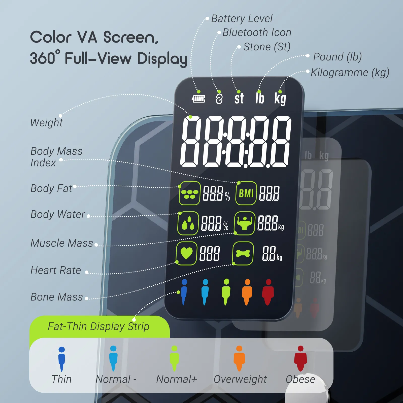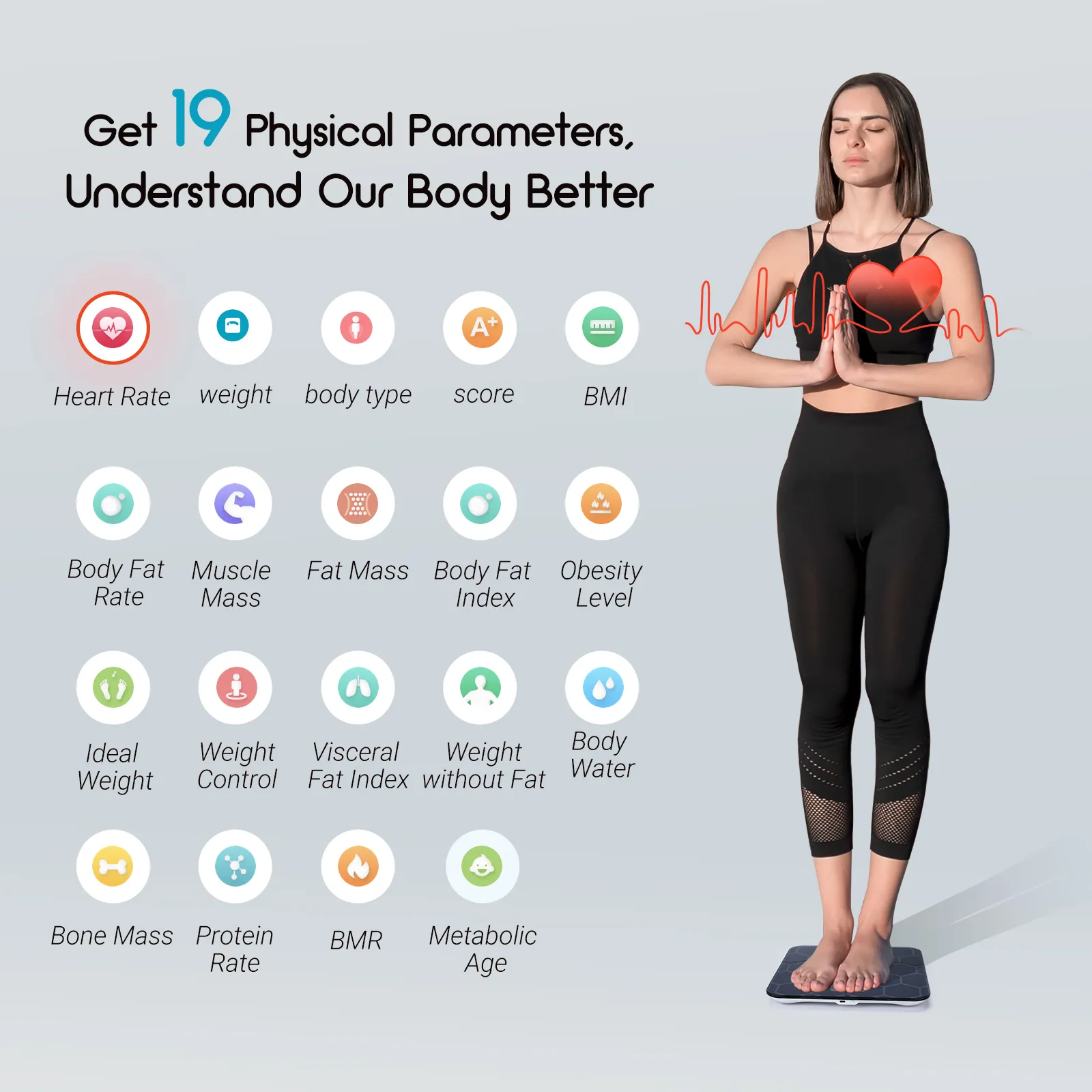 - 【การวิเคราะห์องค์ประกอบของร่างกายทางชีวภาพทางไฟฟ้า19 Essential 】: เครื่องชั่งหมึกสำหรับน้ำหนักตัวและไขมันใช้การวิเคราะห์ความต้านทานไฟฟ้าทางชีวภาพเพื่อคำนวณการวัด19องค์ประกอบของร่างกายได้แก่น้ำหนัก BMI เปอร์เซ็นต์ไขมันมวลกล้ามเนื้อมวลไขมันดัชนีไขมันระดับโรคอ้วน, น้ำหนักในอุดมคติ, การควบคุมน้ำหนัก, ไขมันในอวัยวะภายใน, มวลร่างกายน้อย, เปอร์เซ็นต์ของน้ำ, มวลกระดูก, การเผาผลาญพื้นฐาน, เปอร์เซ็นต์โปรตีน, อายุของร่างกาย, รูปร่างร่างกาย, คะแนนร่างกาย ไม่เพียงแต่ไขมันในร่างกายเท่านั้นแต่ยังแสดงการเปลี่ยนแปลงของอัตราการเต้นของหัวใจโดยรู้สถานะร่างกายของคุณในทุกด้าน