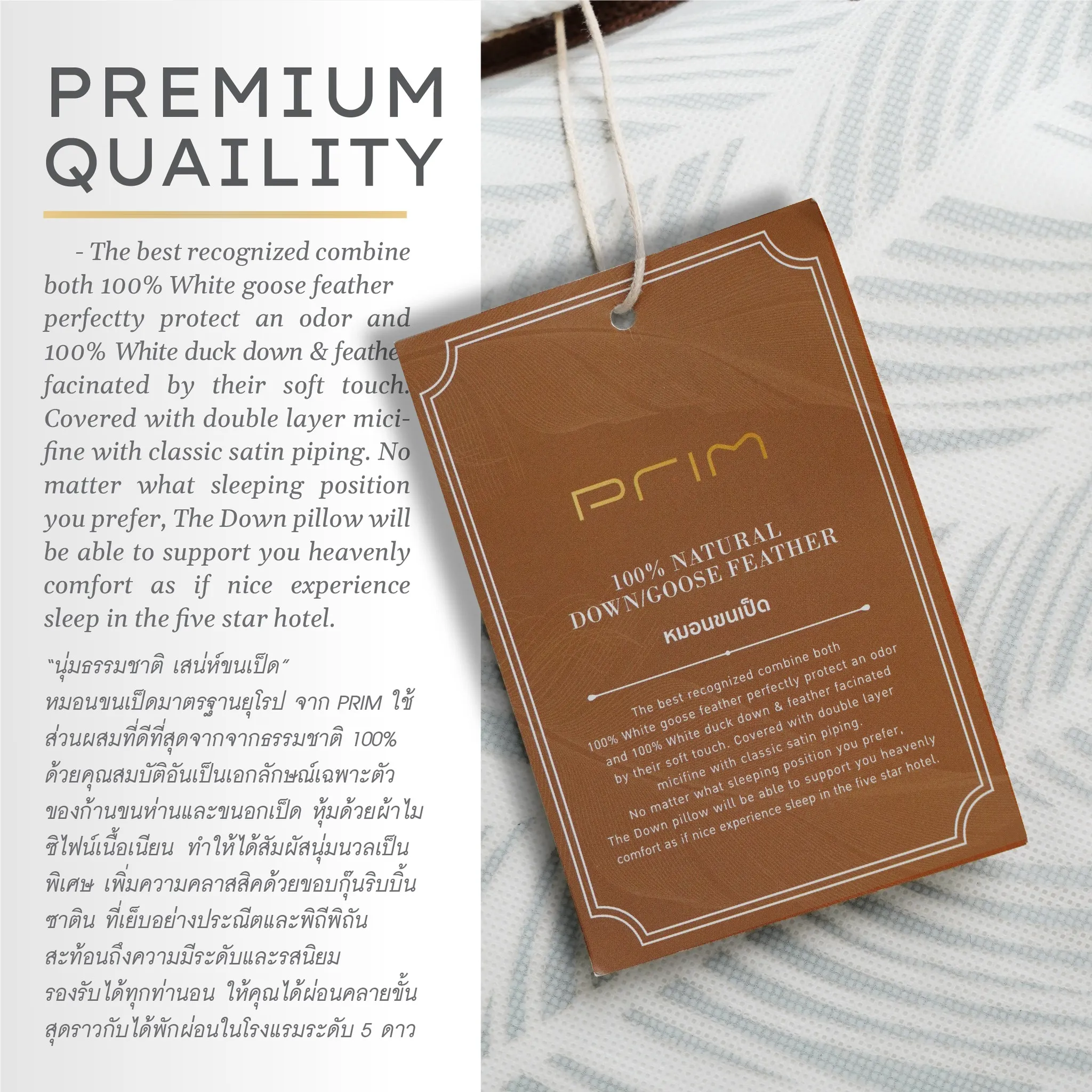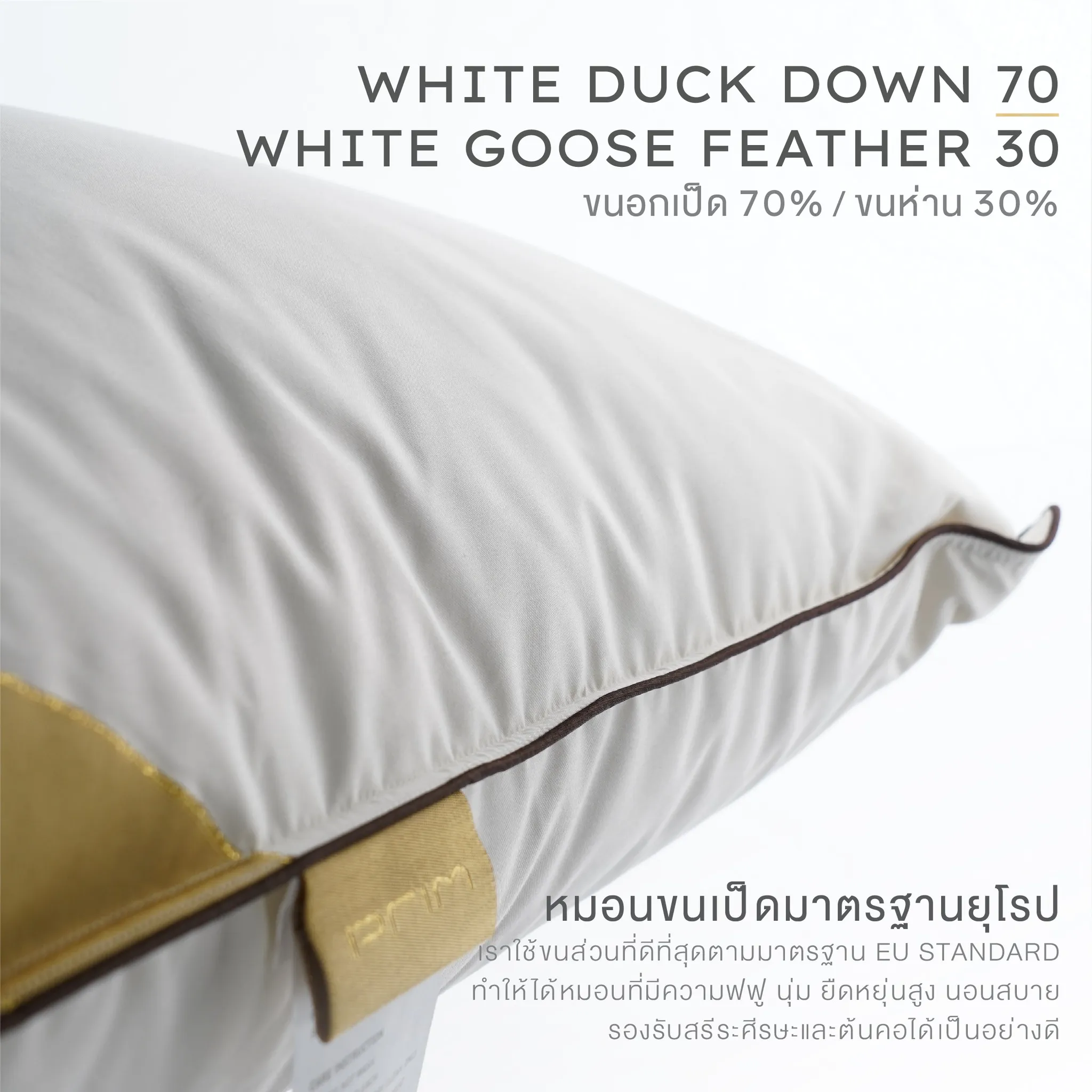 PRIM หมอนขนเป็ด ที่มีส่วนผสมของ ก้านขนห่าน WGF 30% และ ขนเป็ดอ่อน WDD 70% เหมาะสำหรับผู้ที่ชอบนอนหมอนต่ำ