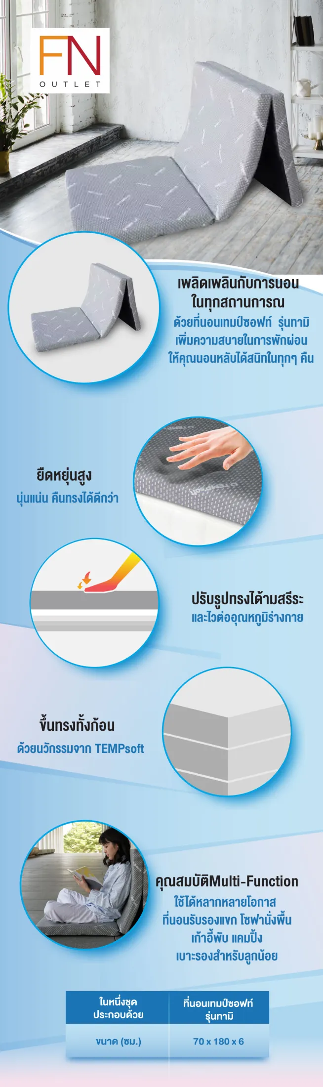 เพลิดเพลินกับการนอนในทุกสถานการณ์ด้วยที่นอนเทมป์ซอฟท์ รุ่นทามิ เพิ่มความสบายในการพักผ่อน ให้คุณนอนหลับได้สนิทในทุกๆ คืน ด้วย Tempsoft คุณสมบัติพิเศษของ Tempsoft ที่ปรับความนุ่มตามอุณหภูมิร่างกาย ทำให้รองรับสรีระและแรงกดทับส่วนบุคคลได้ดี พร้อมระบายความร้อนจากอุณภูมิร่างกาย ทำให้เวลานอนนานๆ ไม่ทำให้รู้สึกร้อน และตื่นมาไม่ปวดหลัง พร้อมรับวันใหม่จากการนอนอย่างเต็มที่