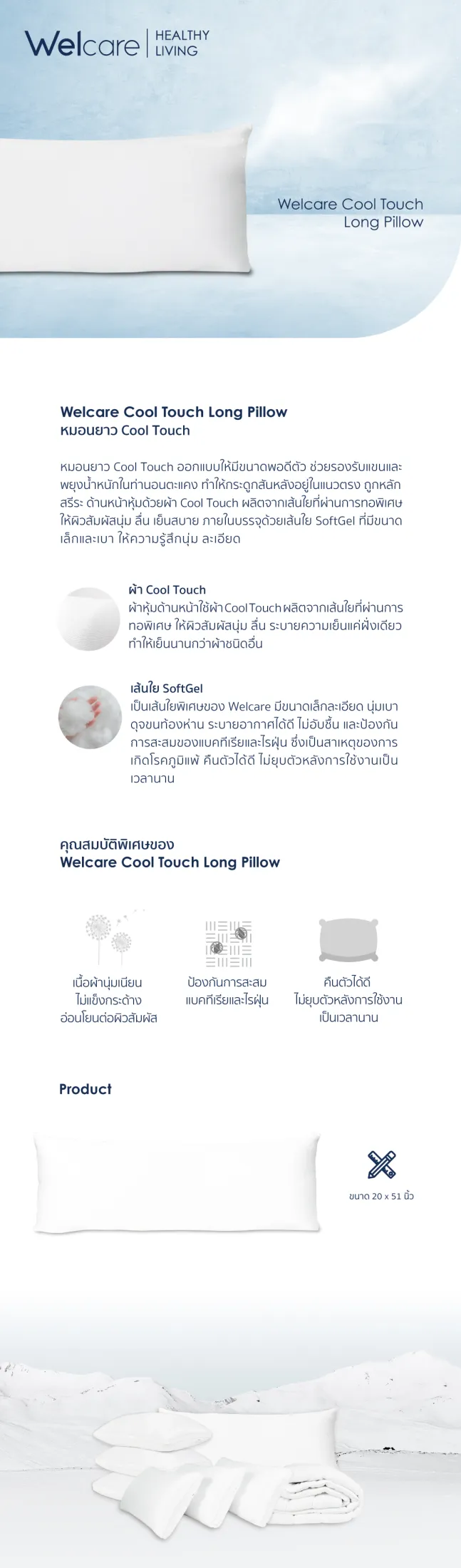 Welcare หมอนใบยาว Cool-touch Long Pillow พยุงในท่านอนตะแคง