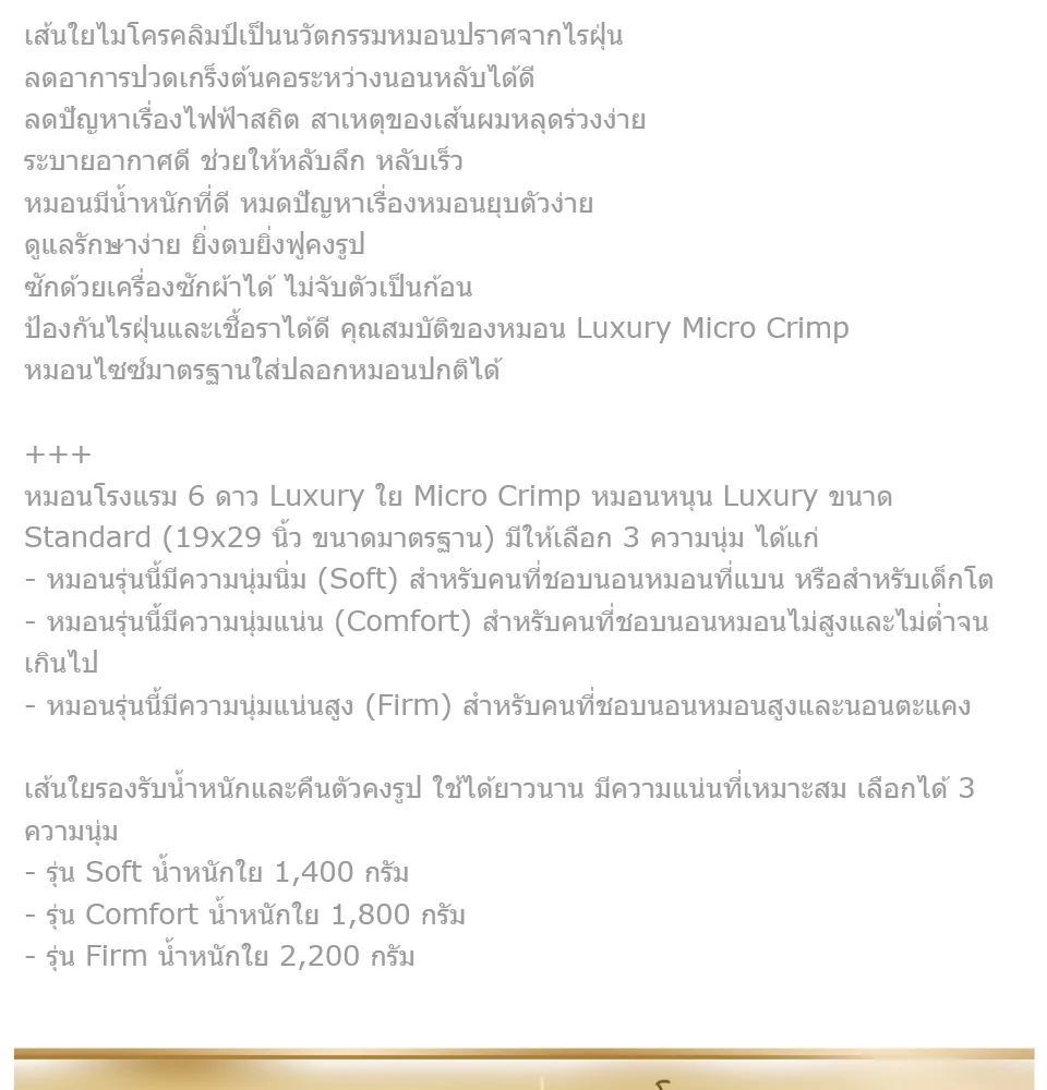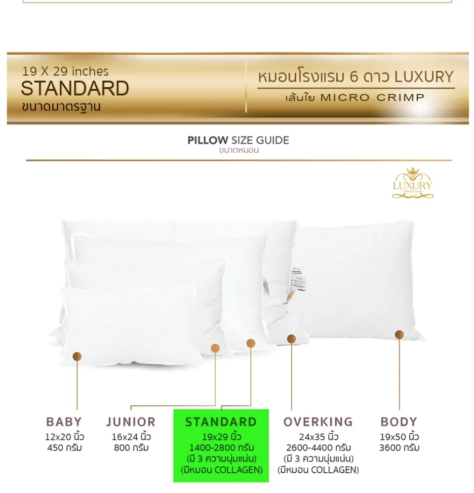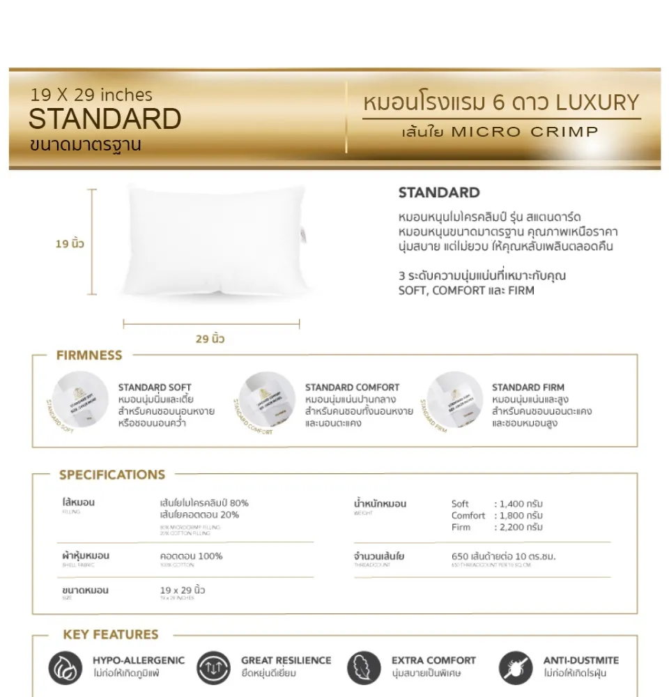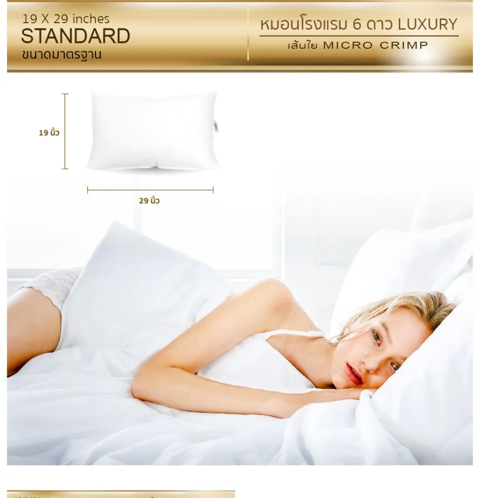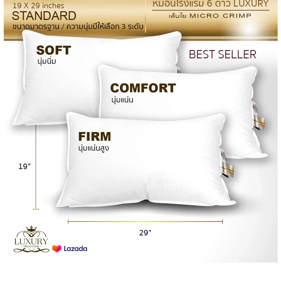 • หมอนโรงแรม 6 ดาว Luxury ใย Micro Crimp หมอนหนุน Luxury ขนาด Standard (19×29 นิ้ว ขนาดมาตรฐาน) มีให้เลือก 3 ความนุ่ม ได้แก่