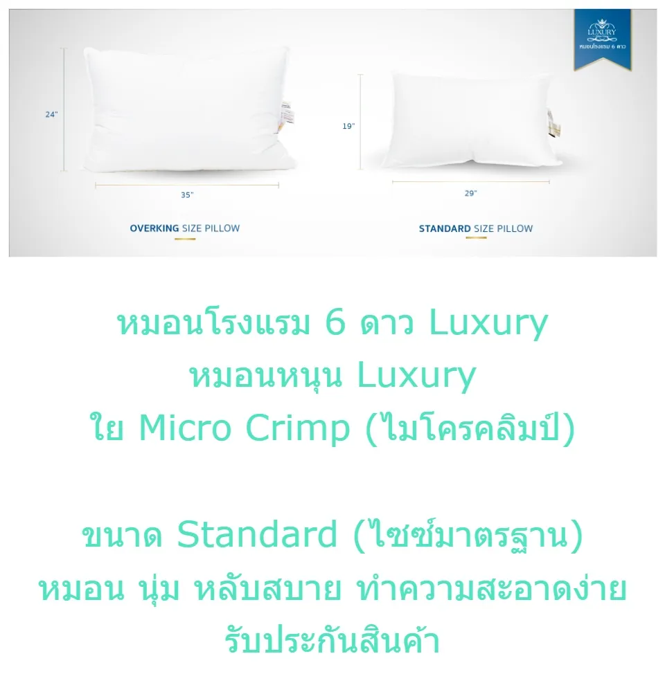 หมอนโรงแรม 6 ดาว Luxury ใย Micro Crimp หมอนหนุน Luxury ขนาด Standard (19×29 นิ้ว ขนาดมาตรฐาน) มีให้เลือก 3 ความนุ่ม หมอน นุ่ม หลับสบาย ทำความสะอาดง่าย รับประกันสินค้า ของแท้ ไม่มีไรฝุ่น ไม่ก่อให้เกิดภูมิแพ้ ไม่เก็บฝุ่น (ไมโครคลิมป์)