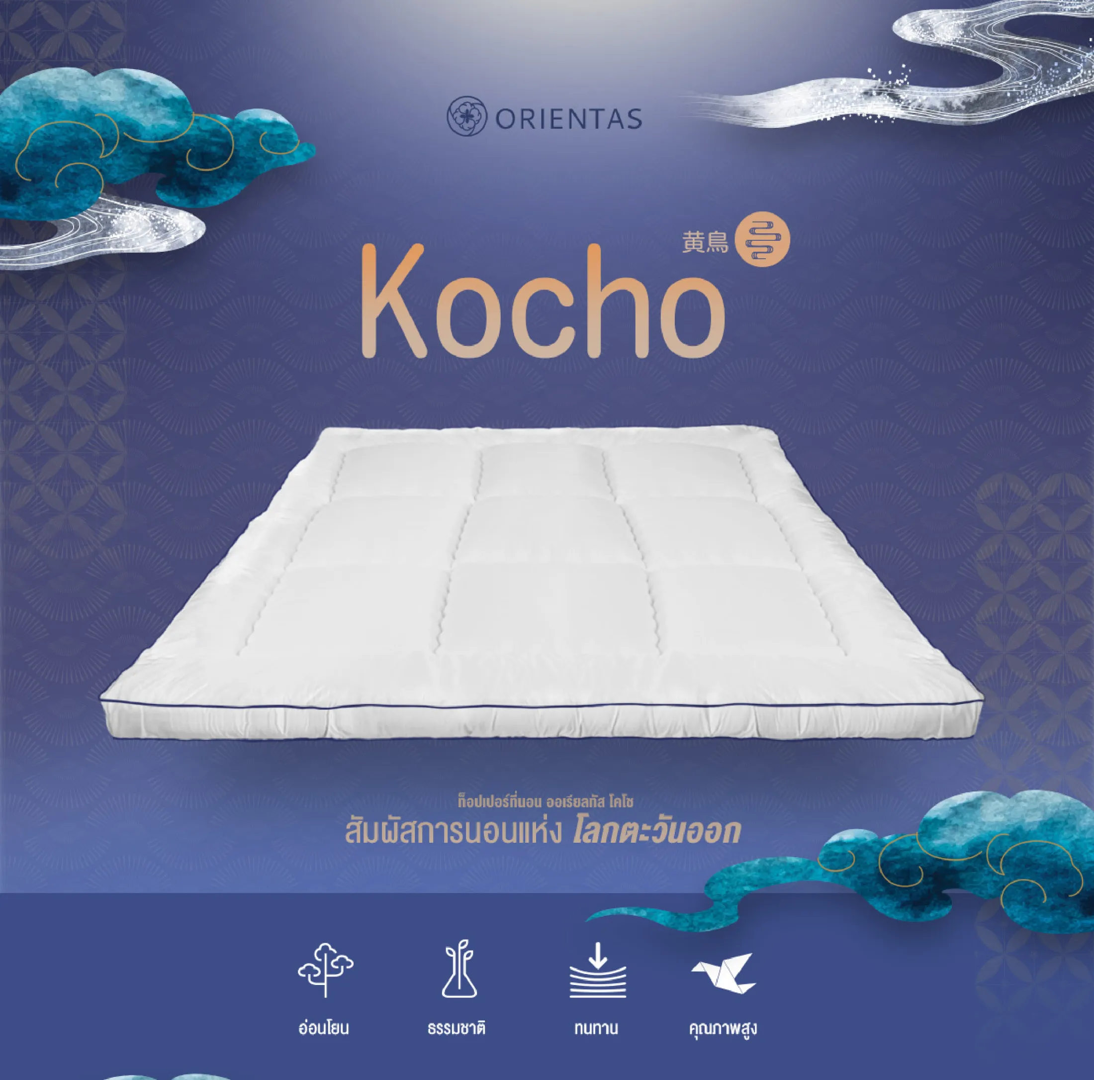 Orientas Night Kocho ท็อปเปอร์ขนห่านเทียม ผลิตจากใยพรีเมี่ยม หนา 4 นิ้ว แก้ปวดหลัง ใช้งานง่าย มีสายรัดมุม 4 ด้าน สามารถใช้เป็นที่นอนเสริม เมื่อที่นอนเก่าเริ่มเสื่อมสภาพหรือรู้สึกแข็งจนเกินไป ให้สัมผัสนุ่ม ฟู รองรับสรีระได้อย่างดีเยี่ยม ลดอาการปวดหลัง เอว และเมื่อยล้า ให้ร่างกายได้พักผ่อนอย่างเต็มที่
