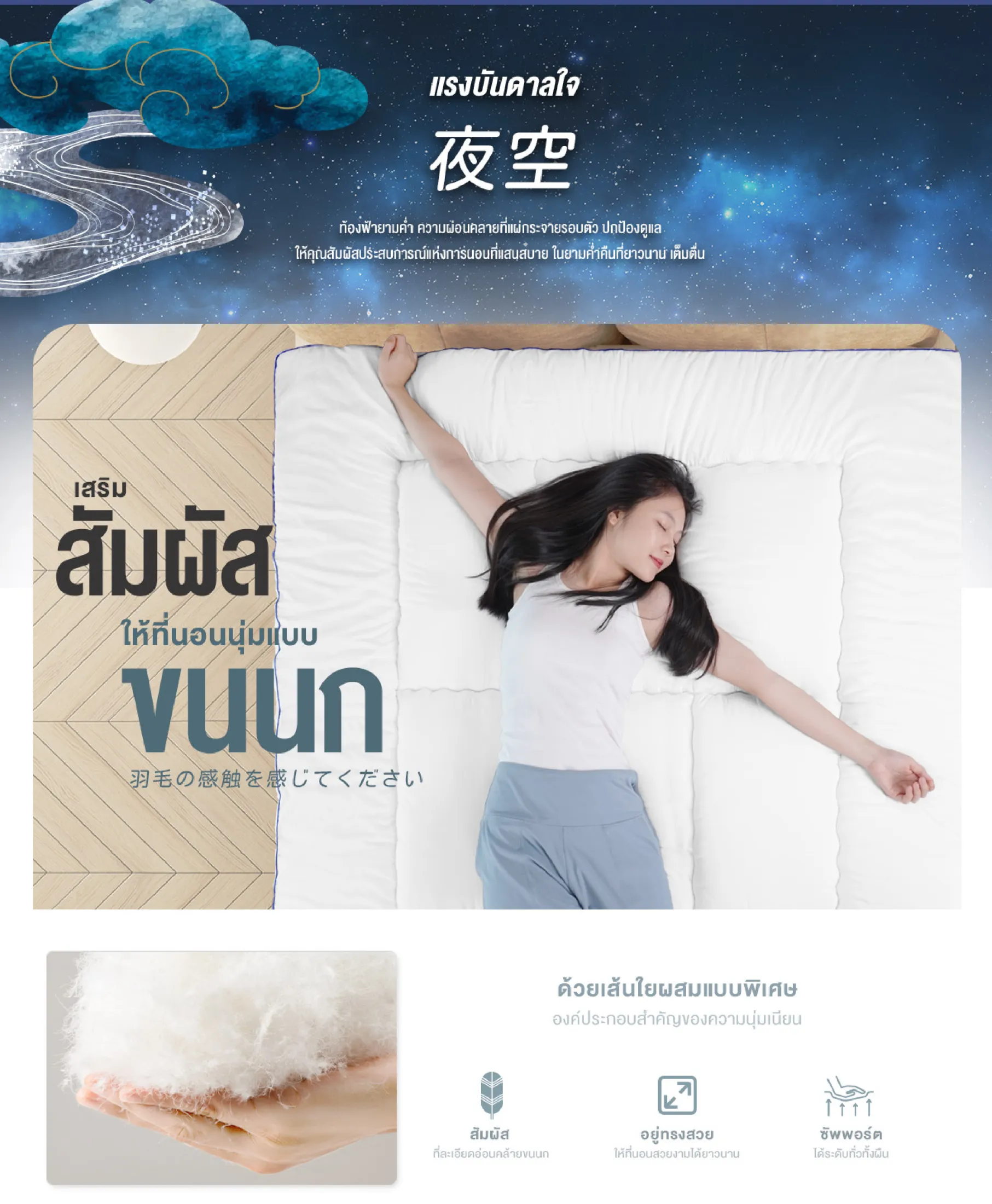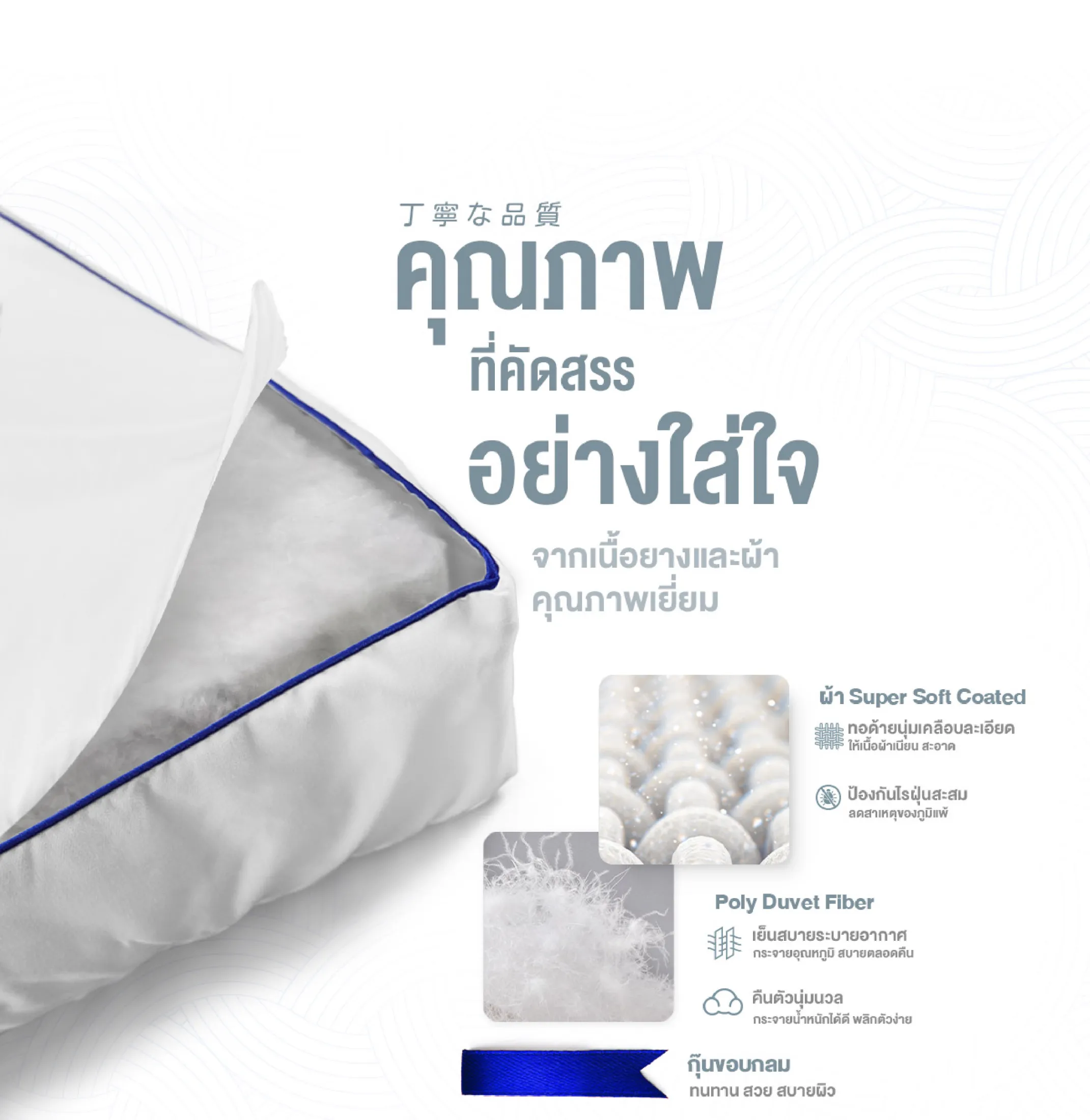 • Poly-duvet Fiber ใยขนห่านเทียมคัดเกรดพิเศษ นิ่มสบาย ให้ทุกครั้งที่คุณนอนรู้สึกเสมือนการนอนบนขนสัตว์จริงๆ ผสานกับเทคโนโลยีการผลิตระดับนาโน เส้นใยเนียนละเอียด ช่วยรองรับสรีระร่างกายได้ดี ที่สำคัญ ไร้เรื่องกลิ่นกวนใจ ผ้าหุ้มนุ่มสบาย อ่อนโยน หมดกังวลเรื่องระคายเคืองผิว