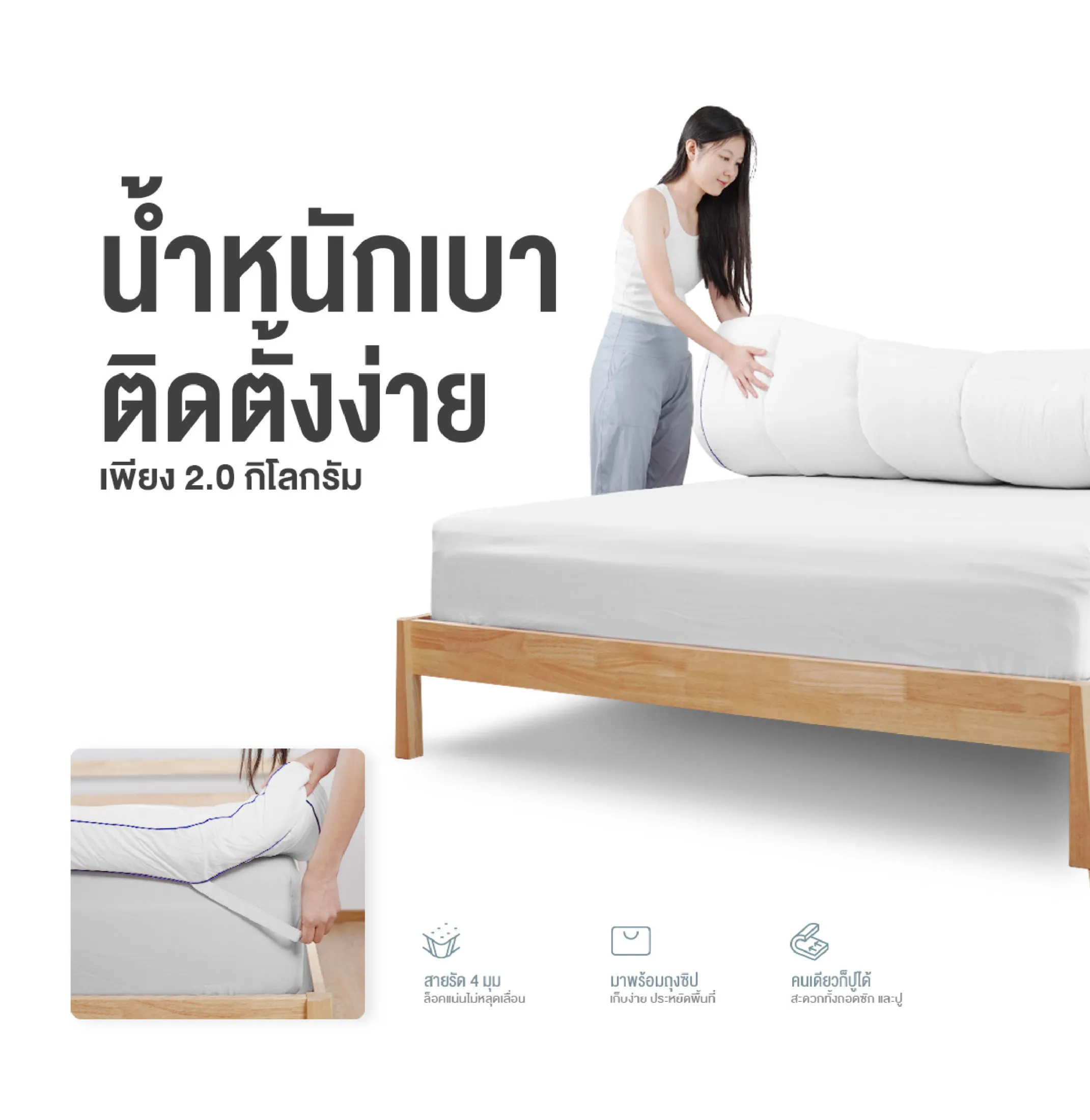 • ใช้งานสะดวก มาพร้อมสายรัดมุม 4 ข้าง ใช้งานง่าย รัดแน่น รองรับได้ทุกท่านอน มั่นใจไม่มีหลุดขอบ