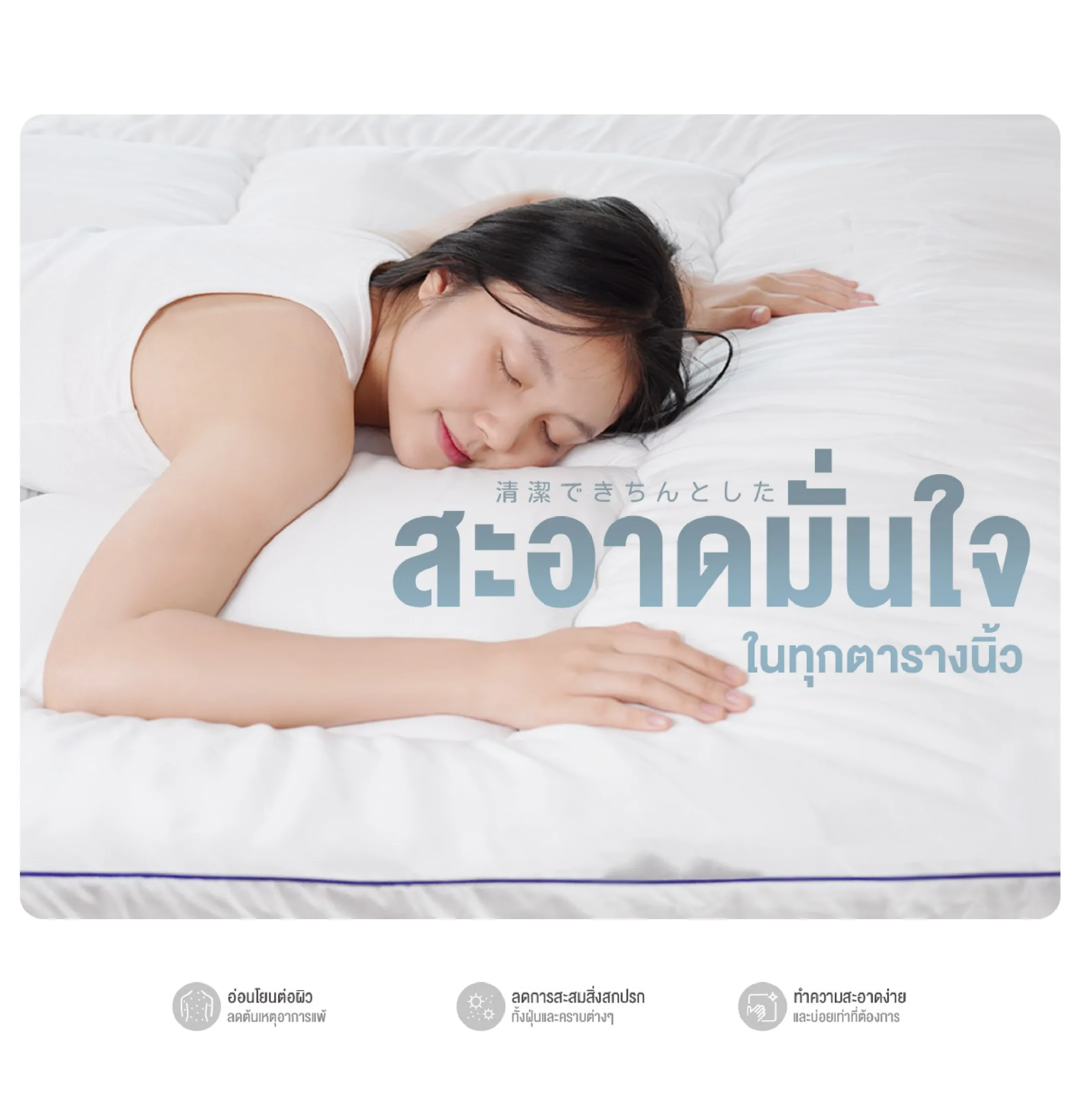 • ผิวสัมผัสด้านบน หุ้มด้วยวัสดุจากผ้าคอตตอน ผ้านุ่มลื่น เย็น สบาย ผสานพลังความนุ่มฟูของเส้นใย จึงช่วยให้การนอนครั้งนี้รู้สึกอ่อนโยนสุดๆ ช่วยลดการระคายเคืองผิว ปลอดภัย แม้ผู้ที่มีผิวบอบบาง แพ้ง่าย