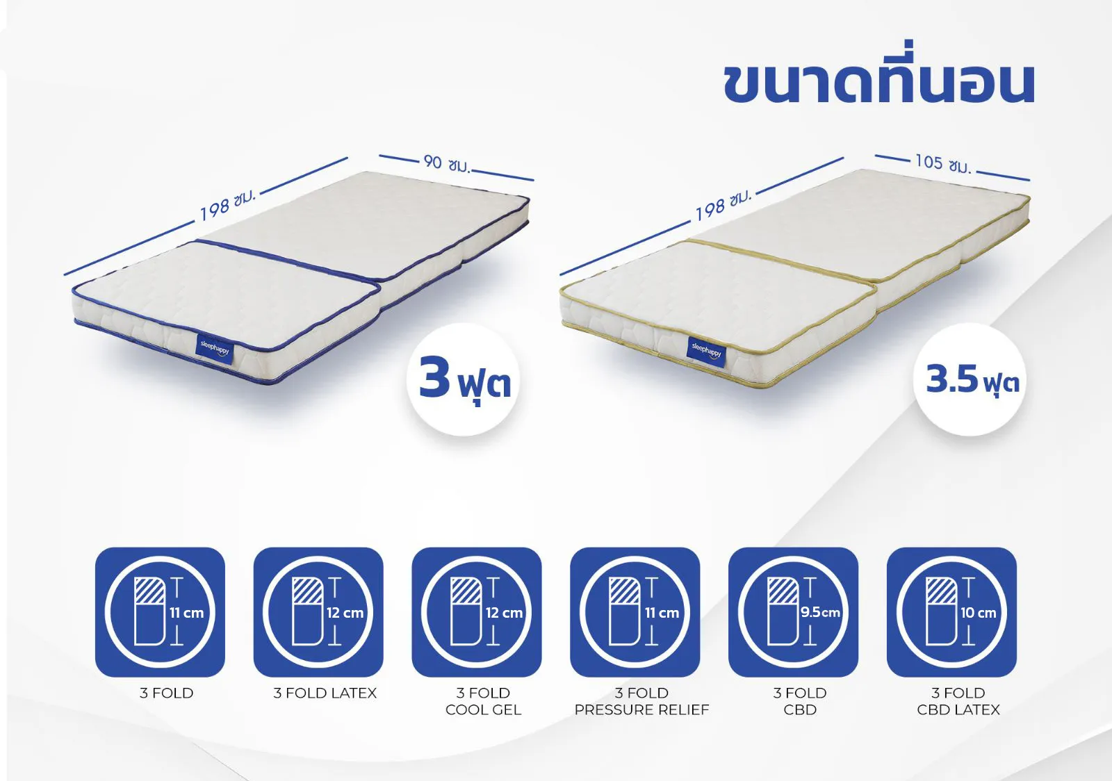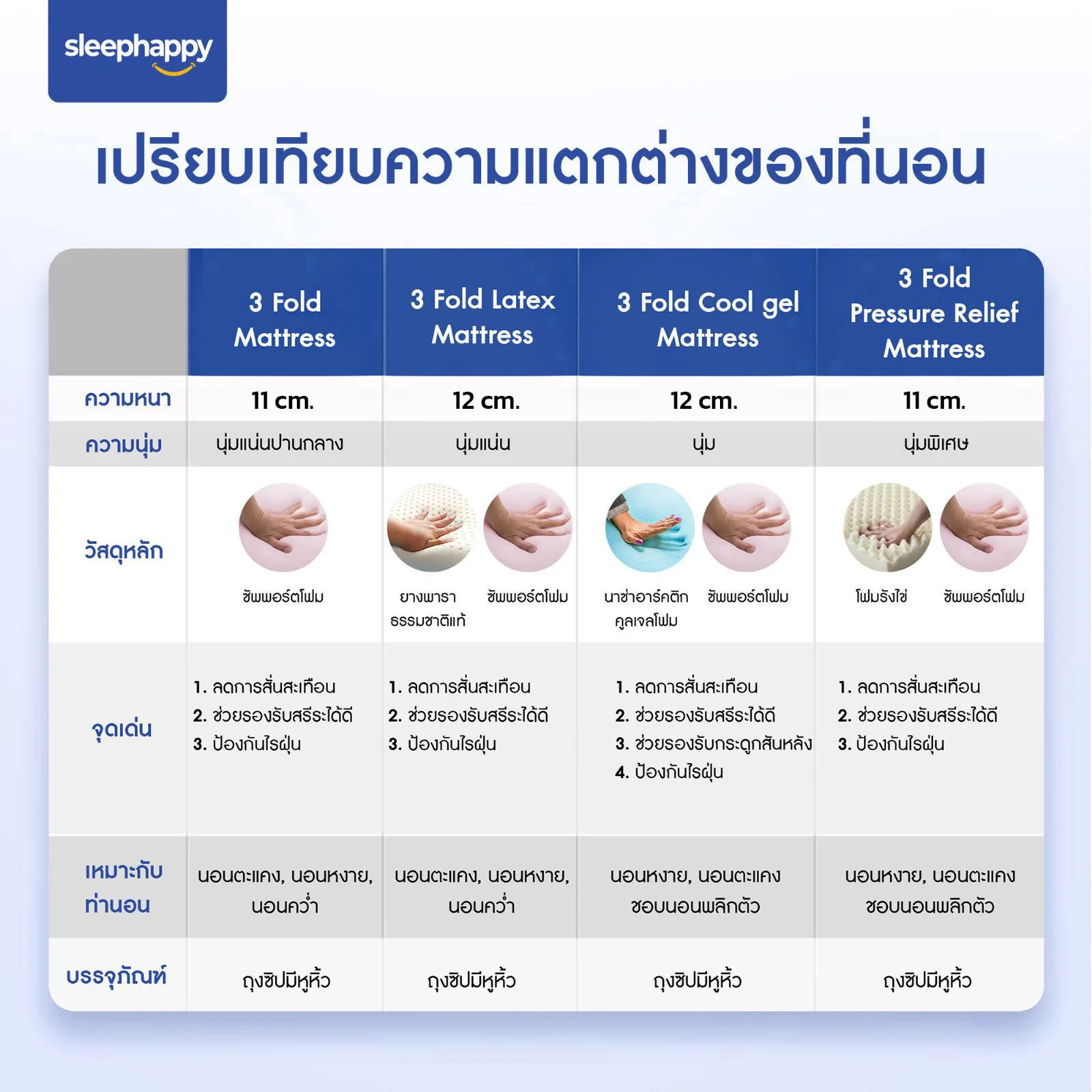 SleepHappy 3 Fold รวมที่นอน 3 พับ ยางพาราธรรมชาติ เมมโมรี่โฟม และเมมโมรี่โฟมคูลเจล ช่วยลดเเรงกดทับ เเละรองรับสรีระได้ดี