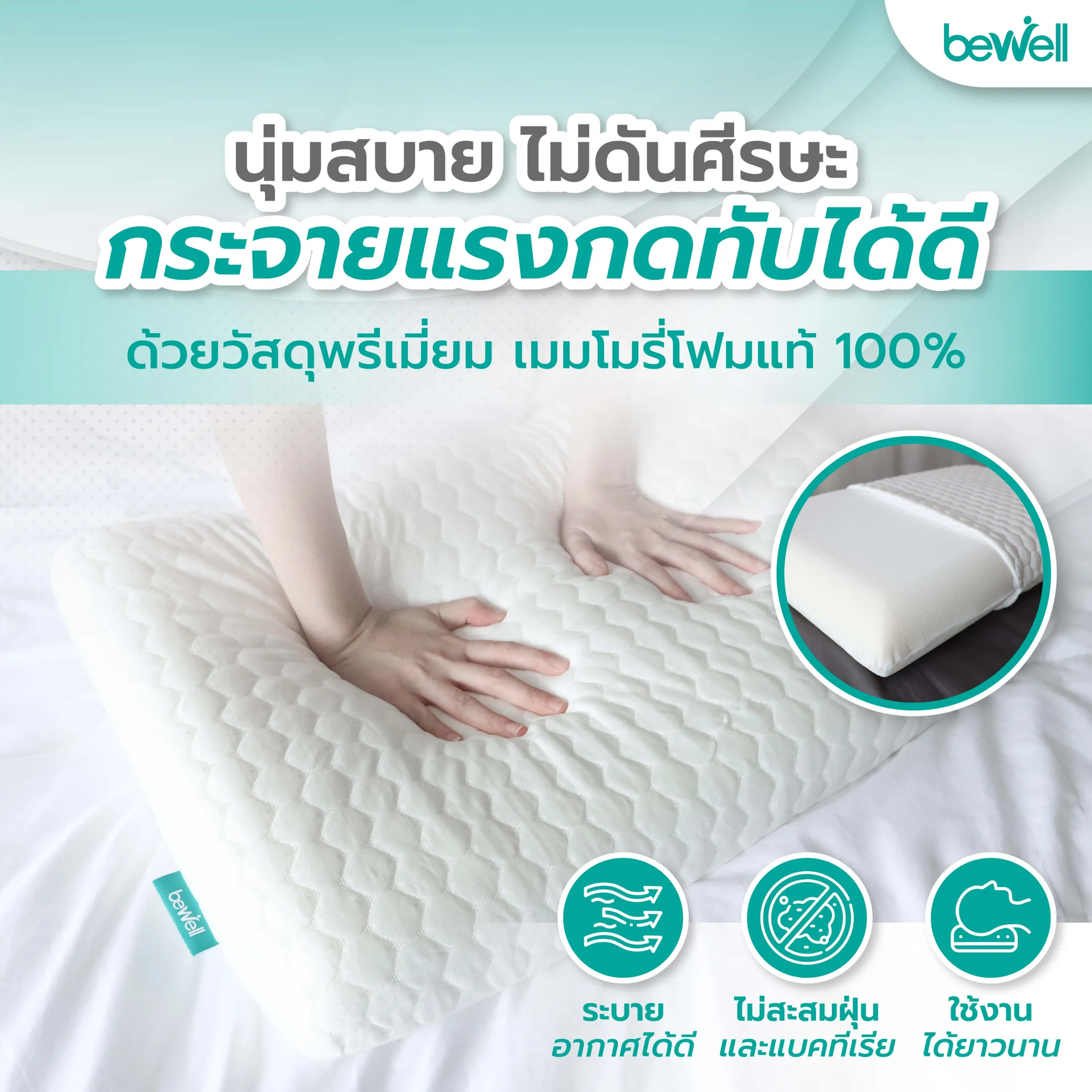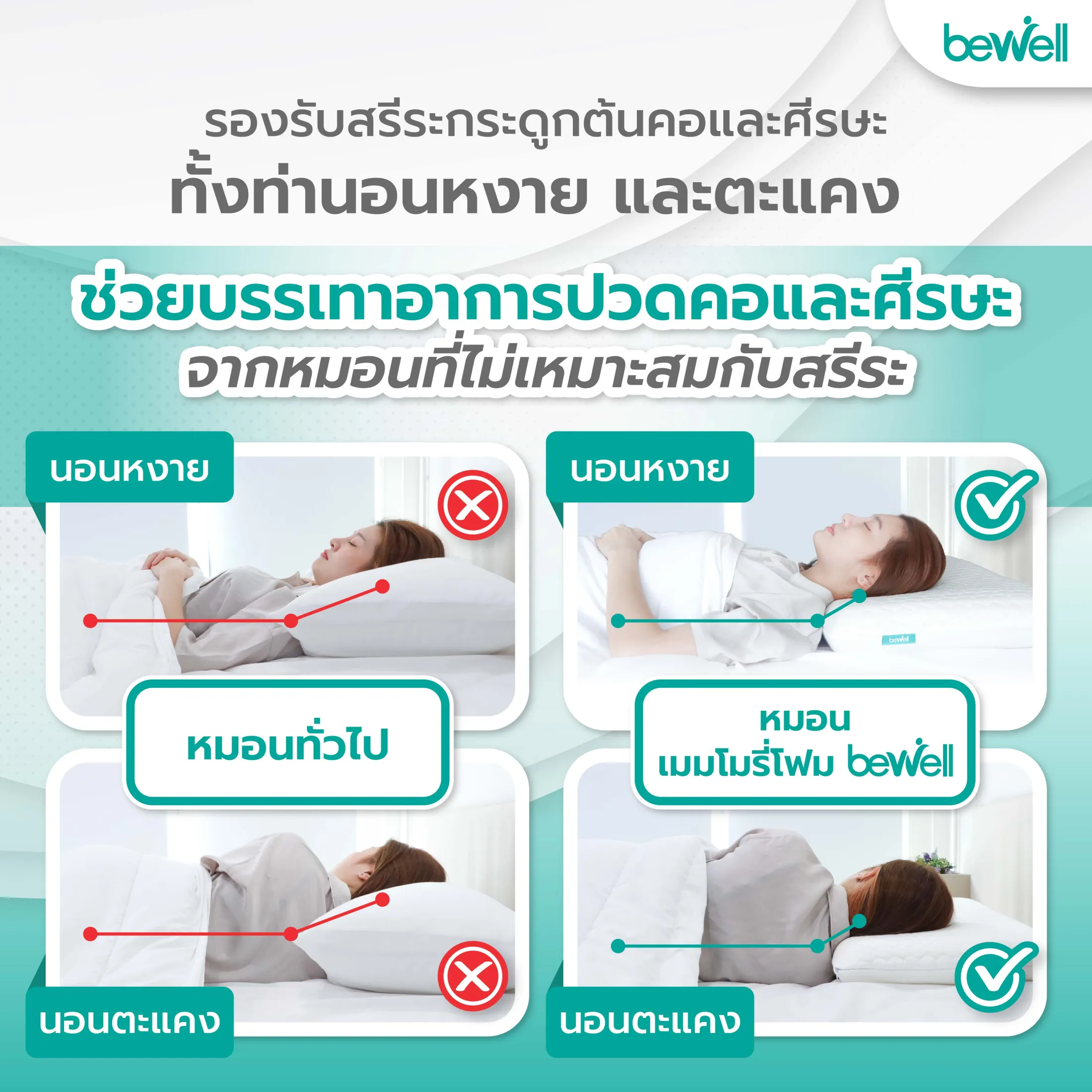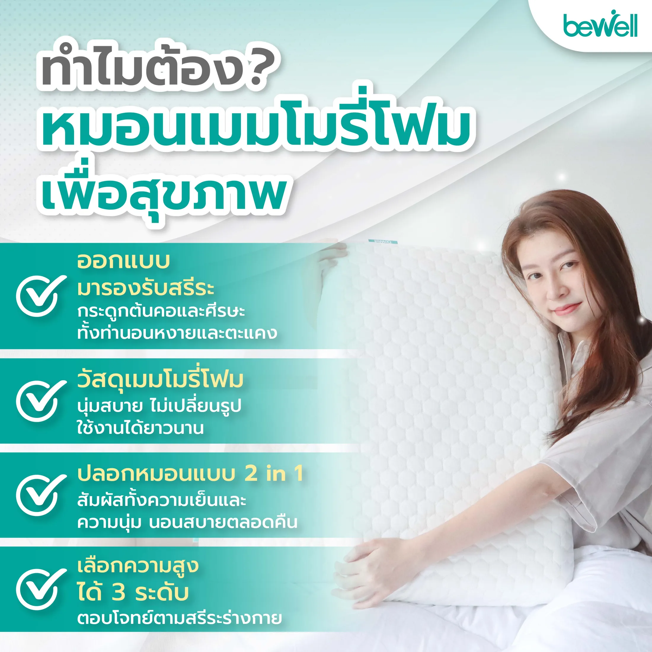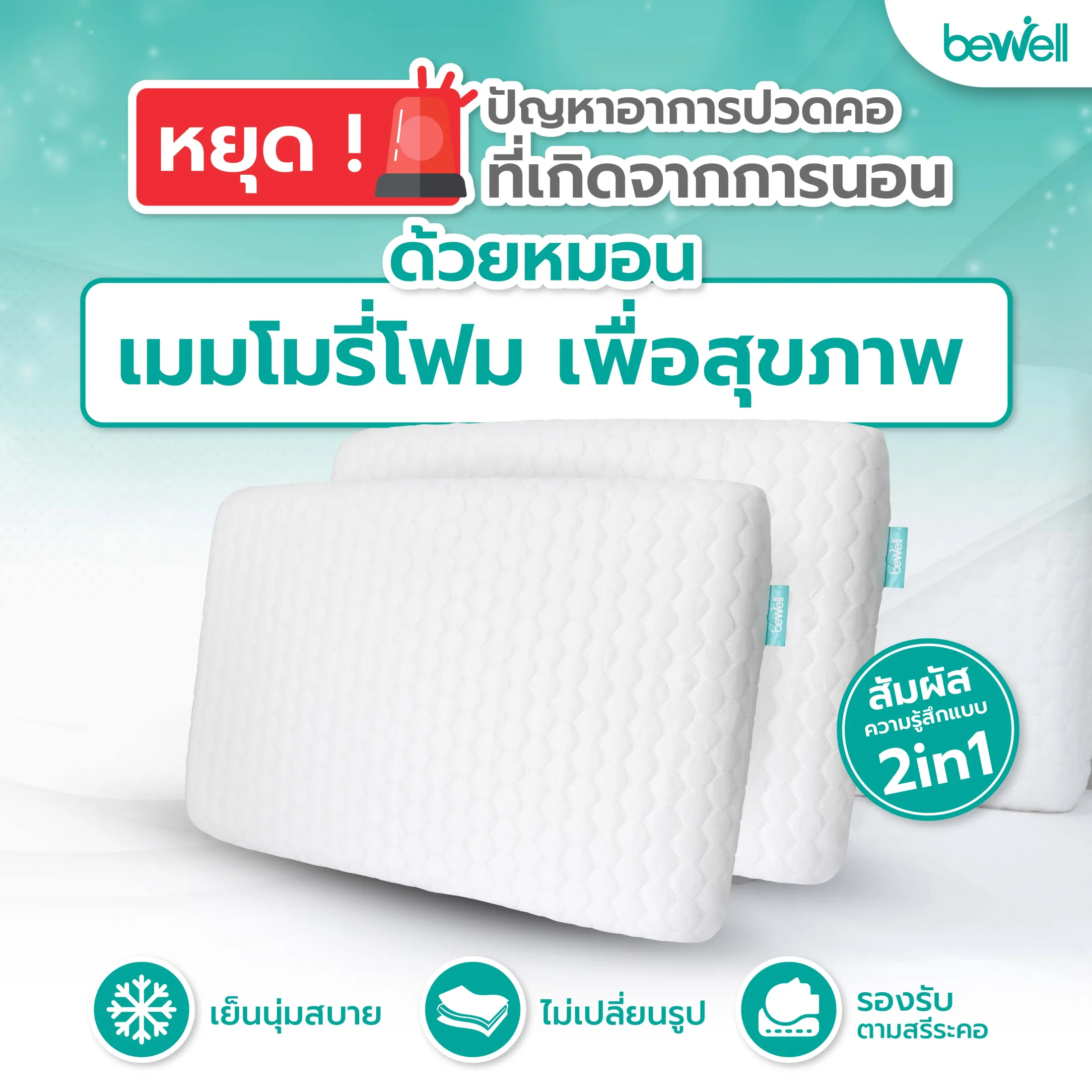 Bewell หมอนเมมโมรี่โฟม 2 in 1 นุ่มสบาย ไม่เปลี่ยนรูป มี 3 ไซส์ รองรับตามสรีระคอ บรรเทาอาการปวดคอที่เกิดจากการนอน