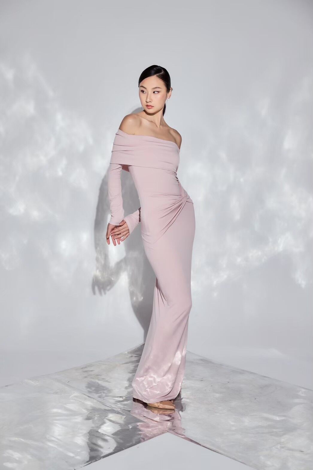 เดรสโอบไหล่แขนยาวผ้ายืดเข้ารูป มาพร้อมกับไหล่โอบที่สามารถรังสรรค์รูปแบบการสวมใส่ได้หลากหลายสไตล์ มีดีเทลแต่งย่นที่ช่วงเอวด้านหน้าเพิ่มความหรูหราและช่วยพรางรูปร่าง