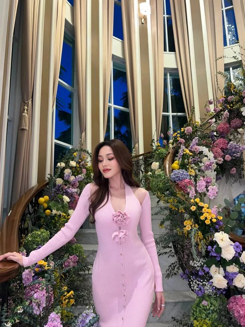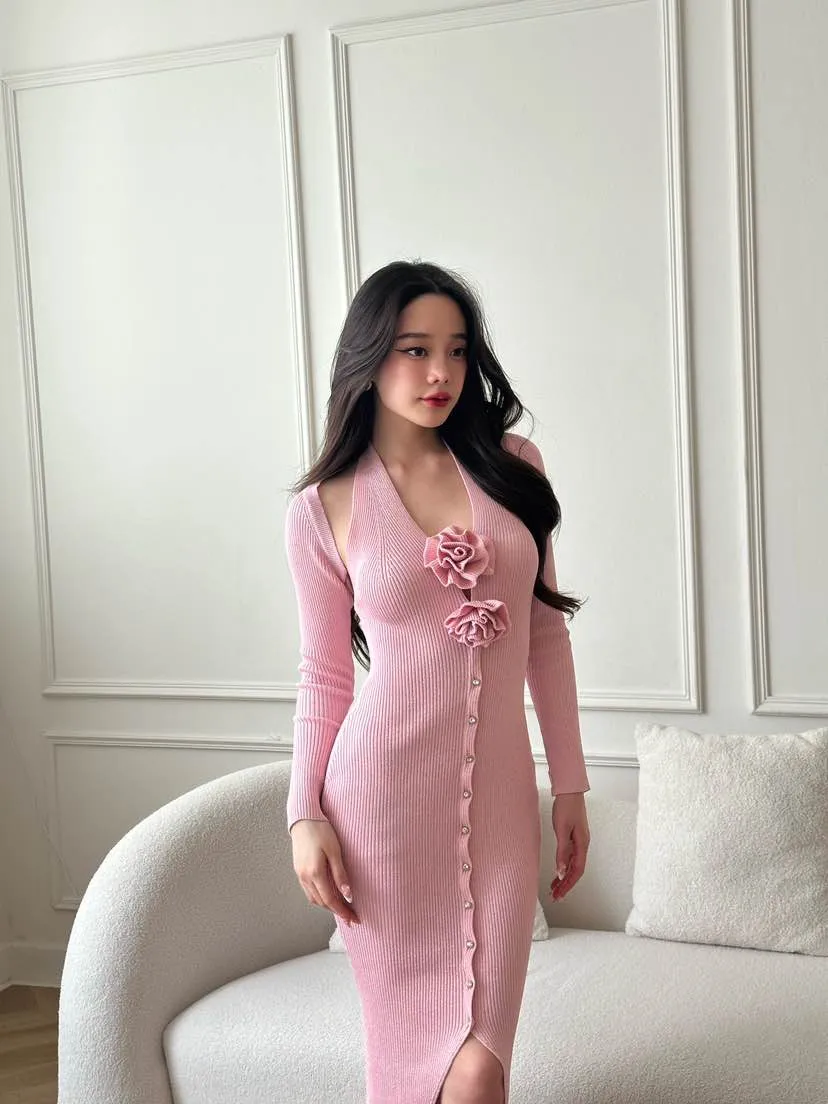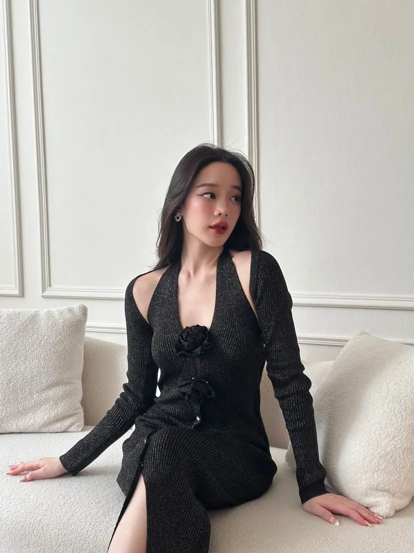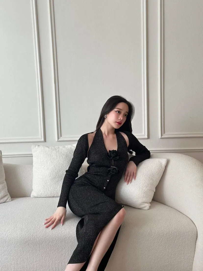CURVF Calla Maxi Knit Dress เดรสผ้าKnit พร้อมเสื้อคลุม กลิตเตอร์ไม่คัน ไม่หลุด ดอกไม้ถอดได้