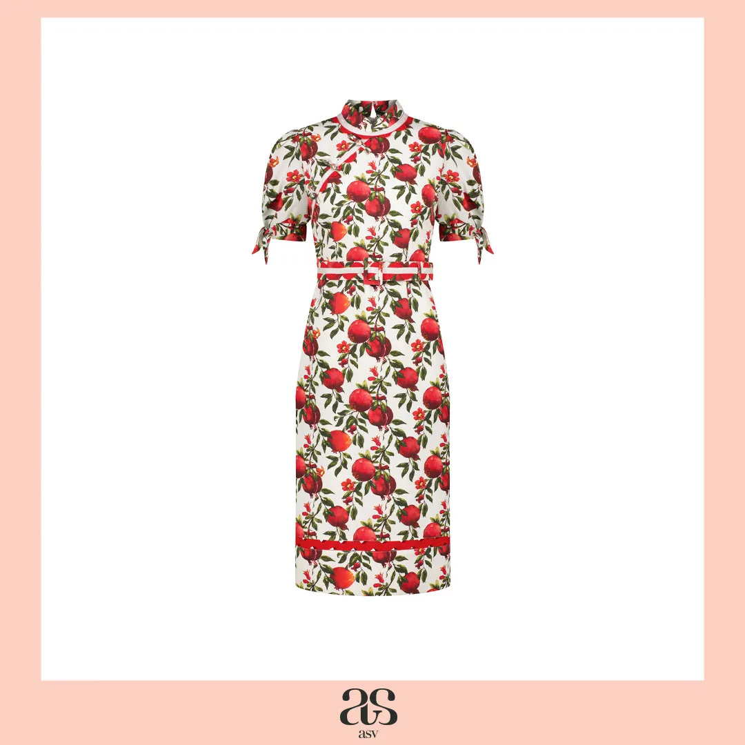 ASV Pomegranate Print Dress เดรสสั้น คอจีน แขนพอง แต่งดีเทลสแกลลอป ผ้าลายผลไม้