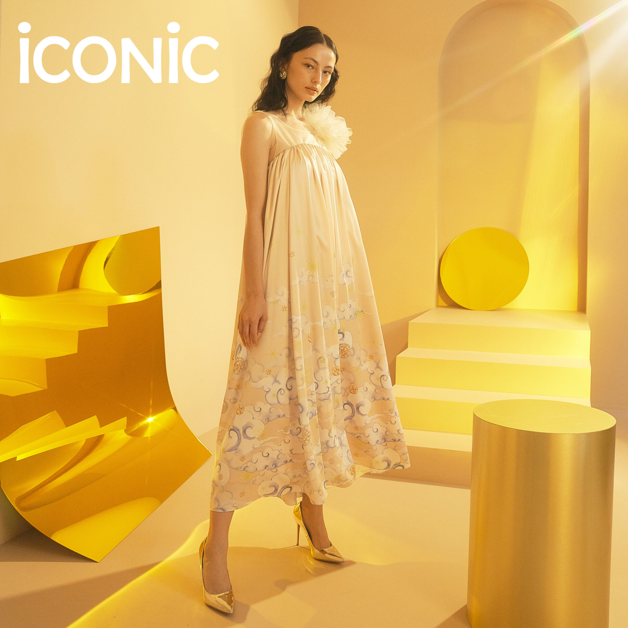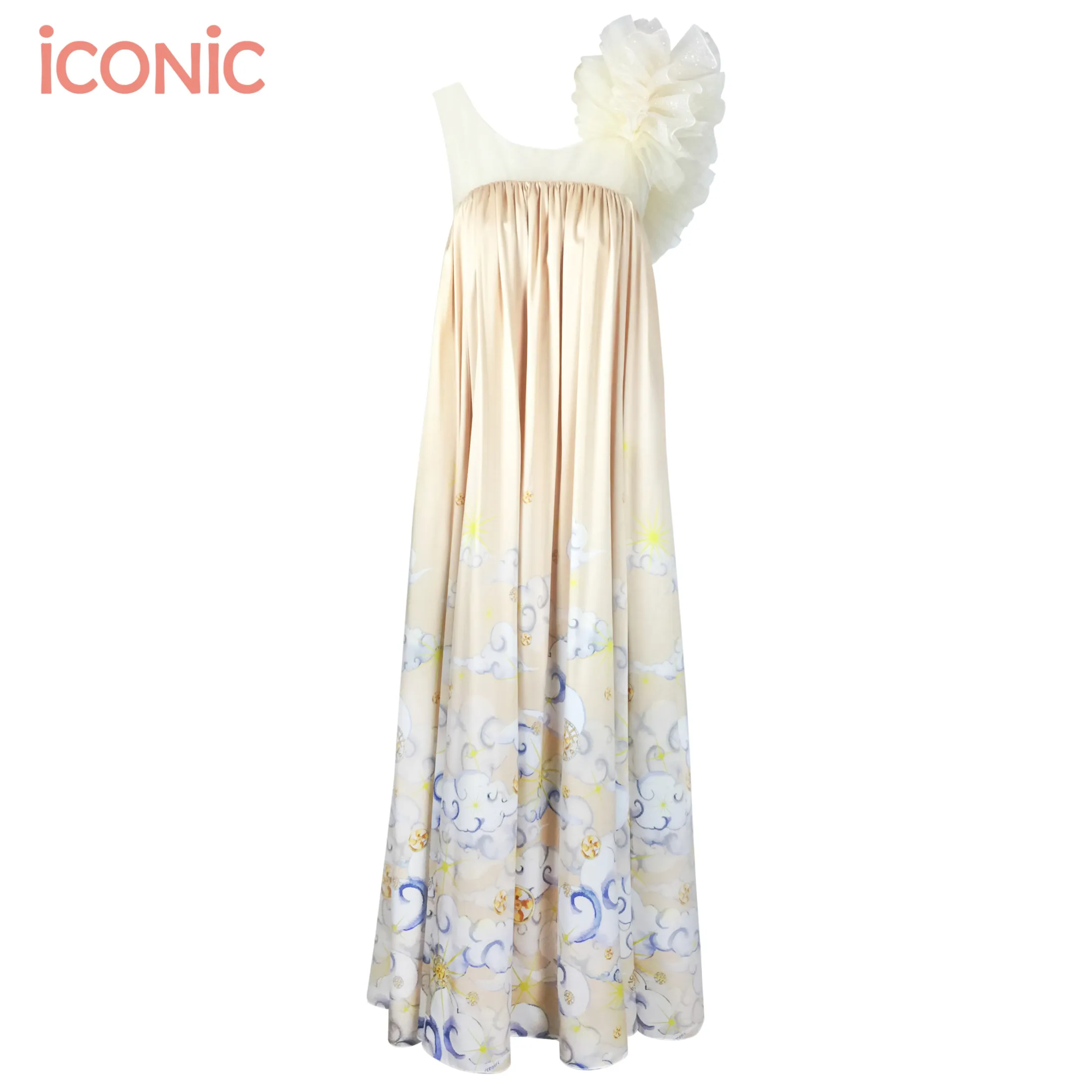 iCONiC OPULENT MAXI DRESS ชุดเดรสยาว ผ้าไหม พิมพ์ลาย ตกแต่ง ระบายฟูช่วงไหล่ เดรสยาว เดรสราตรี ชุดราตรี ชุดออกงาน ชุดเดรสไฮโซ เสื้อผ้าผู้หญิง