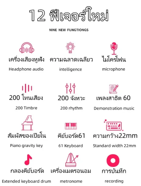 - [ฟังก์ชั่นสินค้า] แป้นพิมพ์เปียโนเลียนแบบ 61 ตัว 200 โทน 200 จังหวะ เพลงสาธิต 60 เพลง
