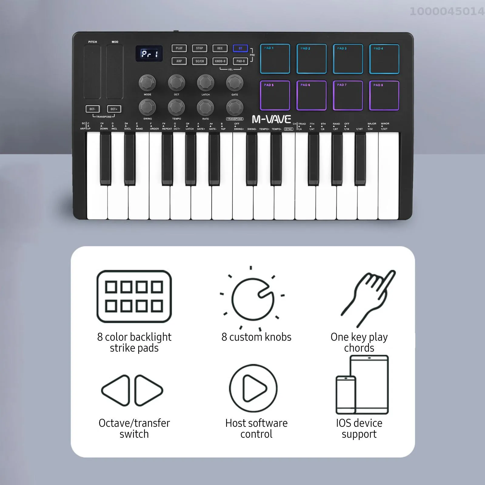 8 RGB Back-lit Pads with Velocity-Sensitive & aftertouch.