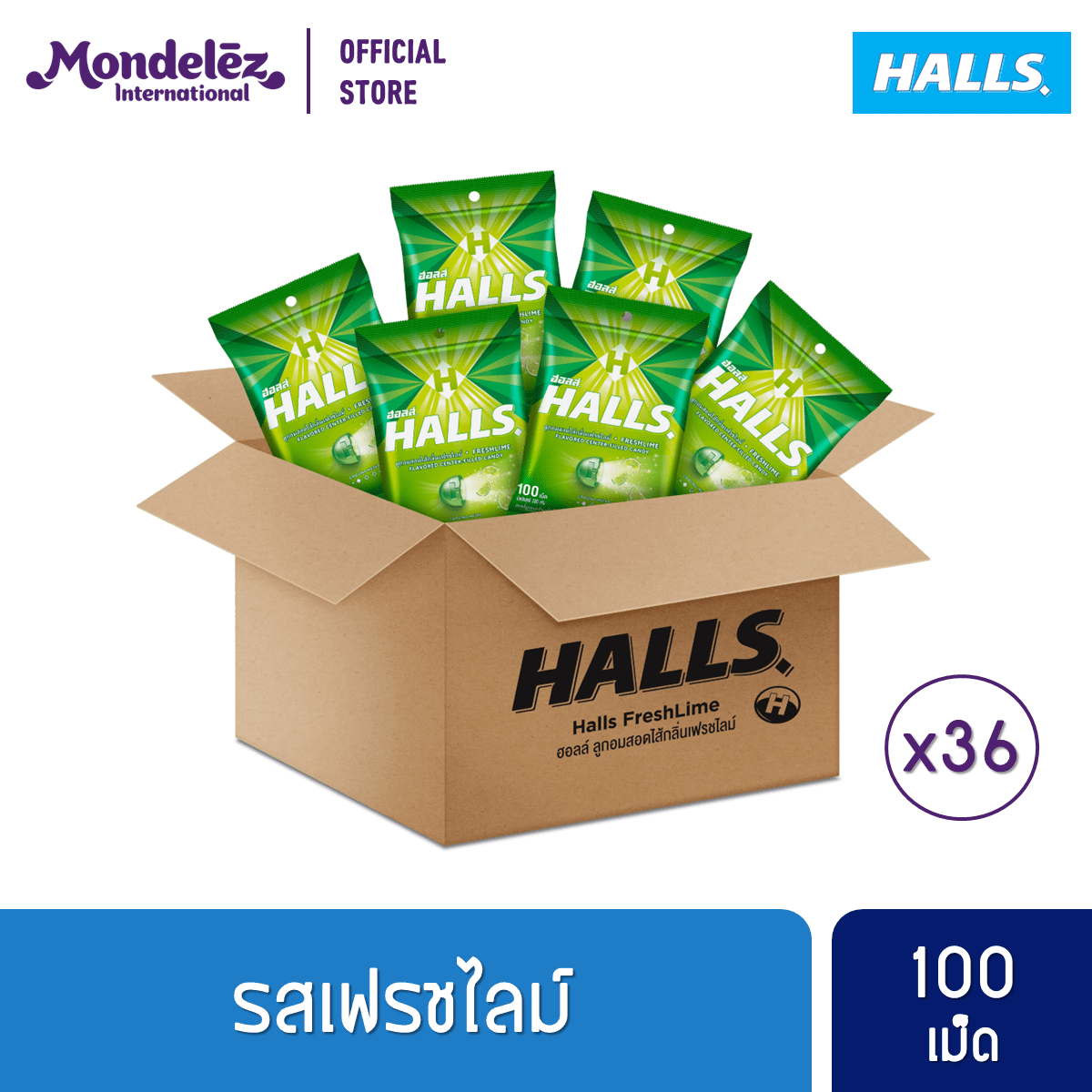 [ยกลัง 36 ถุง] Halls Fresh Lime ฮอลล์ ลูกอมสอดไส้กลิ่นเฟรชไลม์ แบบถุง 100 เม็ด (280 กรัม)