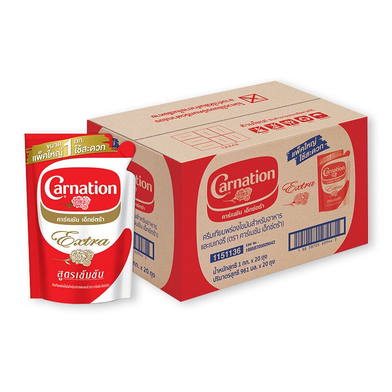 คาร์เนชัน เอ็กซ์ตร้า ครีมเทียมพร่องไขมัน 1 กก. x 20 ถุง Carnation Extra Evaporated Creamer 1 kg x 20 Packs