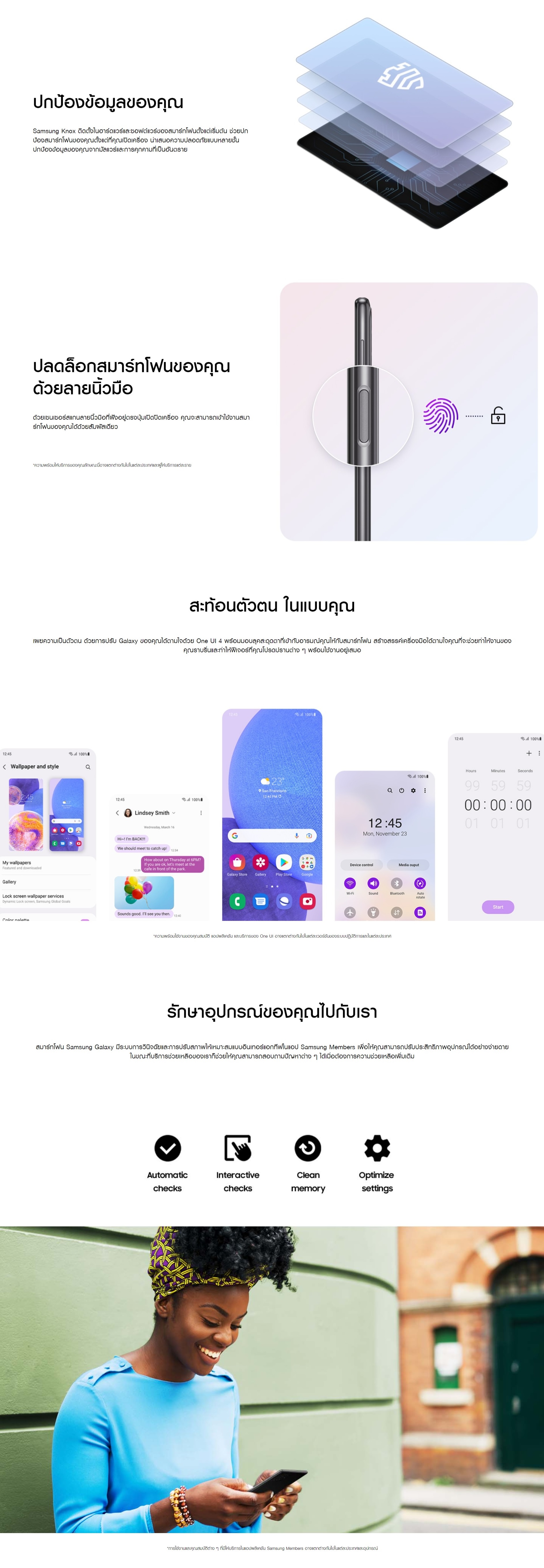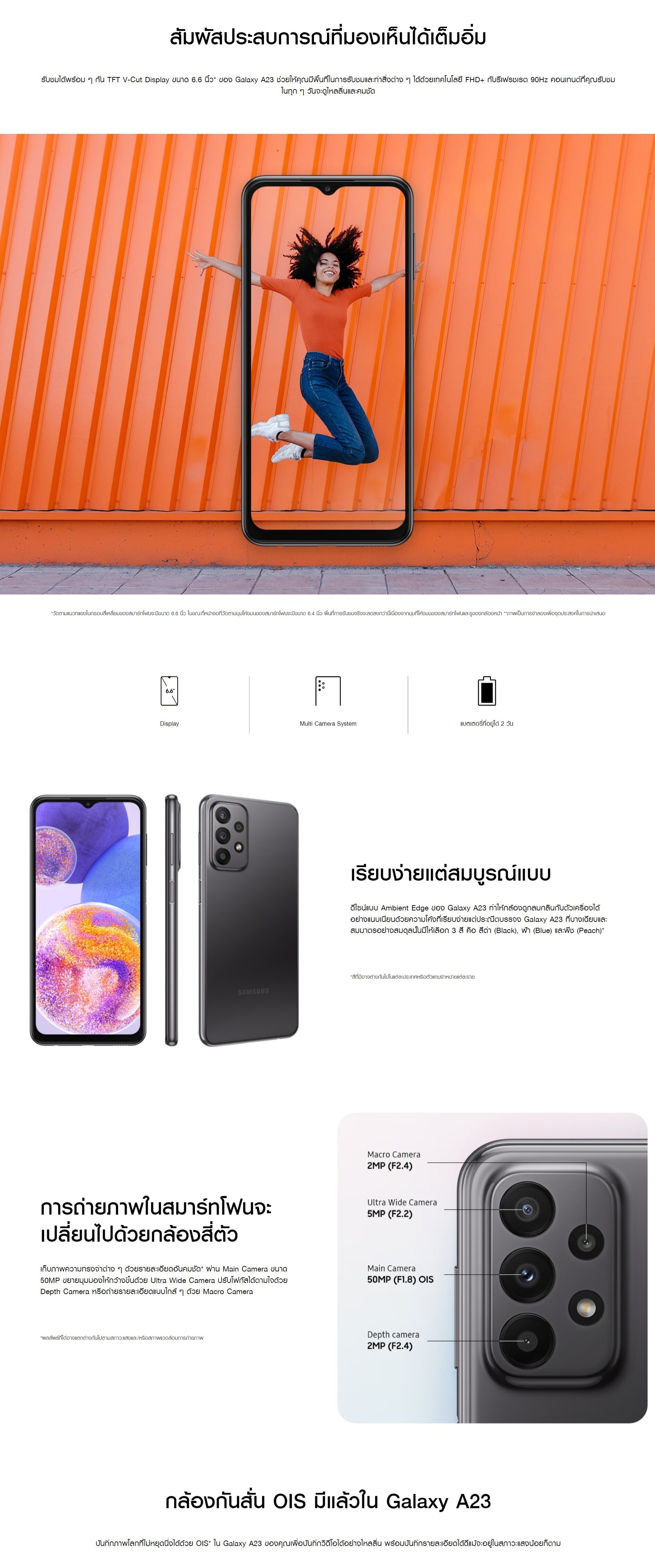 • Display Material : Gorilla Glass 5 • Display dimension/resolution : Display : 6.6 (1080×2408), FHD+ TFT, 20:9, 401PPI, 120Hz • CPU / Type Of CPU : Snapdragon 695 5G (Qualcomm SM6375) • Octa-core CPU • Up to 2.2GHz • Screen Size : 6.6″ • Memory : 8 GB • ROM (ความจุ) : 128 GB • Expandable Memory : up to 1 TB • Operating System : Android 12 • One UI 4.1 • SIM : Nano Sim (2 Slots : 1 Slot for Sim1 and 1 slot for Micro SD Card) • Front Camera : 8MP (F2.2) • Back Camera : (Main) 50 MP F1.8 (OIS) • (Ultra wide) 2MP F.2.2 • (Depth) 2 MP F2.4 • (Macro) 2 MP F2.4 • Video record : FHD (1920 x 1080)@30fps • Network : Main 2G GSM GSM850,GSM900,DCS1800,PCS1900 • Main 3G UMTS(WCDMA) B1(2100),B2(1900),B4(AWS),B5(850),B8(900) • Main 4G LTE FDD B1(2100),B2(1900),B3(1800),B4(AWS),B5(850),B7(2600),B8(900),B12(700),B17(700),B20(800),B26(850),B28(700),B66(AWS-3) • Main 4G LTE TDD B38(2600),B40(2300),B41(2500) • Main 4G 4×4 MIMO band B1(2100),B3(1800),B4(AWS),B7(2600),B66(AWS-3),B38(2600),B41(2500) • Main 5G Sub6 FDD N1(2100),N3(1800),N5(850),N7(2600),N8(900),N28(700) • Main 5G Sub6 TDD N40(2300),N41(2500),N77(3700),N78(3500) • Main 5G 4×4 MIMO band N1(2100),N3(1800),N7(2600),N41(2500),N77(3700),N78(3500) • Sub 2G GSM GSM850,GSM900,DCS1800,PCS1900 • Sub 3G UMTS(WCDMA) B1(2100),B2(1900),B4(AWS),B5(850),B8(900) • Sub 4G LTE FDD B1(2100),B2(1900),B3(1800),B4(AWS),B5(850),B7(2600),B8(900),B12(700),B17(700),B20(800),B26(850),B28(700),B66(AWS-3) • Sub 4G LTE TDD B38(2600),B40(2300),B41(2500) • Bluetooth Version : Bluetooth v5.0 • Wi-Fi : WiFi : 802.11 a/b/g/n/ac 2.4G+5GHz, WiFi Direct • Water Resistant : No • Charging : USB Type-C • Fast charge 25W • Earjack : 3.5 earphone jack • USB Type : USB Type-C • การรองรับ MHL : No • การรองรับ NFC : YES • การรองรับ Samsung DeX : No • Sensor : Accelerometer,Fingerprint Sensor,Gyro Sensor,Geomagnetic Sensor,Virtual Light Sensing,Virtual Proximity Sensing • Security : fingerprint sensor • Authentication : Lock type: pattern, PIN, password • Biometric lock type: Fingerprint, Face recognition • การรองรับ Gear : Galaxy Buds2 Pro,Galaxy Buds Pro,Galaxy Buds Live,Galaxy Buds+,Galaxy Buds2,Galaxy Buds,Galaxy Fit2,Galaxy Fit e,Galaxy Fit,Galaxy Watch5,Galaxy Watch4,Galaxy Watch3,Galaxy Watch,Galaxy Watch Active2,Galaxy Watch Active,Gear Fit2 Pro,Gear Fit2,Gear Sport,Gear S3,Gear S2,Gear IconX (2018) • Video Playback Format : MP4,M4V,3GP,3G2,AVI,FLV,MKV,WEBM • Audio Playback Format : MP3,M4A,3GA,AAC,OGG,OGA,WAV,AMR,AWB,FLAC,MID,MIDI,XMF,MXMF,IMY,RTTTL,RTX,OTA • Battery : 5,000 mAh • Product Dimensions H*W*D : 164.5 x 76.5 x 8.8 mm • Product Weight : 195g • Full Box Size H*W*D : 167.1 x 80.8 x 30 mm • Full Box Weight : 270g