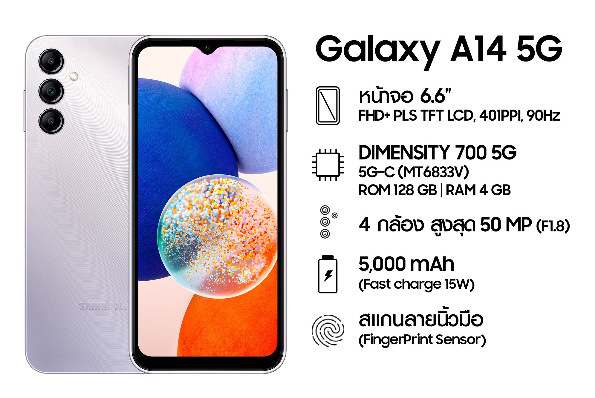 âĒ āļāļāļēāļ : 167.7 x 78 x 9.1mm âĒ āļāđāļģāļŦāļāļąāļ : 201 g âĒ āļŦāļāđāļēāļāļ : Panda-MN228 âĒ āļāļ§āļēāļĄāļĨāļ°āđāļāļĩāļĒāļāļŦāļāđāļēāļāļ : āļŦāļāđāļēāļāļ : 6.6′ (1080×2408), FHD+ PLS TFT LCD, 401PPI, 90Hz âĒ āļāļīāļāđāļāđāļ : 5G-C (MT6833V) âĒ āļāļāļēāļāļŦāļāđāļēāļāļ : 6.6 āļāļīāđāļ§ âĒ RAM (āļāļ§āļēāļĄāļāļģ) : 4 GB âĒ ROM (āļāļ§āļēāļĄāļāļļ) : 128 GB âĒ āđāļāļīāđāļĄāļāļ§āļēāļĄāļāļģ : up to 1 TB âĒ āļĢāļ°āļāļāļāļāļīāļāļąāļāļīāļāļēāļĢ : Android 13 âĒ One UI 5.0 âĒ āļāđāļāļāđāļŠāđāļāļīāļĄ : Nano-SIM (4FF) (Dual Sim : SIM 1 + SIM 2 + MicroSD) âĒ āļāļĨāđāļāļāļŦāļāđāļē : 13MP (F2.0) âĒ āļāļĨāđāļāļāļŦāļĨāļąāļ : ‘(āļāļĨāđāļāļāļŦāļĨāļąāļ) 50 MP F1.8 âĒ (āļāļĨāđāļāļ Macro) 2MP F.2.4 âĒ (āļāļĨāđāļāļ Depth) 2 MP F2.4’ âĒ āļāļēāļĢāļāļąāļāļ§āļĩāļāļĩāđāļ : FHD (1920 x 1080) | @30fps âĒ āļāļēāļĢāđāļāļ·āđāļāļĄāļāđāļ : ‘Main 2G GSM GSM850,GSM900,DCS1800,PCS1900 âĒ Main 3G UMTS(WCDMA) B1(2100),B2(1900),B4(AWS),B5(850),B8(900) âĒ Main 4G LTE FDD B1(2100),B2(1900),B3(1800),B4(AWS),B5(850),B7(2600),B8(900),B12(700),B17(700),B20(800),B26(850),B28(700),B66(AWS-3) âĒ Main 4G LTE TDD B38(2600),B40(2300),B41(2500) âĒ Main 4G 4×4 MIMO band B1(2100),B3(1800),B7(2600),B38(2600),B41(2500) âĒ Main 5G Sub6 FDD N1(2100),N3(1800),N5(850),N7(2600),N8(900),N20(800),N28(700) âĒ Main 5G Sub6 TDD N40(2300),N41(2500),N78(3500) âĒ Main 5G 4×4 MIMO band N1(2100),N3(1800),N7(2600),N41(2500),N78(3500) âĒ Sub 2G GSM GSM850,GSM900,DCS1800,PCS1900 âĒ Sub 3G UMTS(WCDMA) B1(2100),B2(1900),B4(AWS),B5(850),B8(900) âĒ Sub 4G LTE FDD B1(2100),B2(1900),B3(1800),B4(AWS),B5(850),B7(2600),B8(900),B12(700),B17(700),B20(800),B26(850),B28(700),B66(AWS-3) âĒ Sub 4G LTE TDD B38(2600),B40(2300),B41(2500) âĒ Sub 5G Sub6 FDD N1(2100),N3(1800),N5(850),N7(2600),N8(900),N20(800),N28(700) âĒ Sub 5G Sub6 TDD N40(2300),N41(2500),N78(3500)’ âĒ Bluetooth āđāļ§āļāļĢāđāļāļąāđāļ : Bluetooth v5.2 âĒ Wi-Fi : WiFi : 802.11 a/b/g/n/ac 2.4G+5GHz, VHT80 âĒ āļāļąāļāļāđāļģ : āđāļĄāđāļāļąāļāļāđāļģ âĒ āļāļēāļĢāļāļēāļĢāđāļāđāļ : āļĢāļāļāļĢāļąāļāļāļēāļĢāđāļāđāļĢāđāļ§ 15W âĒ āļŦāļđāļāļąāļ : 3.5mm Stereo âĒ USB Type : USB Type-C âĒ āļāļēāļĢāļĢāļāļāļĢāļąāļ MHL : āđāļĄāđāļĢāļāļāļĢāļąāļ âĒ āļāļēāļĢāļĢāļāļāļĢāļąāļ NFC : āđāļĄāđāļĢāļāļāļĢāļąāļ âĒ āļāļēāļĢāļĢāļāļāļĢāļąāļ Samsung DeX : āđāļĄāđāļĢāļāļāļĢāļąāļ âĒ āđāļāđāļāđāļāļāļĢāđ Sensor : Accelerometer,Fingerprint Sensor,Gyro Sensor,Geomagnetic Sensor,Light Sensor,Proximity Sensor âĒ āļāļ§āļēāļĄāļāļĨāļāļāļ āļąāļĒ : āļŠāđāļāļāļāļīāđāļ§ fingerprint sensor âĒ āļāļēāļĢāļĨāđāļāļ : ‘āļāļĢāļ°āđāļ āļāļāļēāļĢāļĨāđāļāļ: pattern, PIN, password âĒ Biometric lock type: Fingerprint’ âĒ āļāļēāļĢāļĢāļāļāļĢāļąāļāļāļļāļāļāļĢāļāđāđāļŠāļĢāļīāļĄ : Galaxy Buds2 Pro,Galaxy Buds Pro,Galaxy Buds Live,Galaxy Buds+,Galaxy Buds2,Galaxy Buds,Galaxy Fit2,Galaxy Fit e,Galaxy Fit,Galaxy Watch5,Galaxy Watch4,Galaxy Watch3,Galaxy Watch,Galaxy Watch Active2,Galaxy Watch Active,Gear Fit2 Pro,Gear Fit2,Gear Sport,Gear S3,Gear S2,Gear IconX (2018) âĒ āļĢāļāļāļĢāļąāļāđāļāļĨāđāļ§āļĩāļāļĩāđāļ : MP4,M4V,3GP,3G2,AVI,FLV,MKV,WEBM âĒ āļĢāļāļāļĢāļąāļāđāļāļĨāđāđāļŠāļĩāļĒāļ : MP3,M4A,3GA,AAC,OGG,OGA,WAV,AMR,AWB,FLAC,MID,MIDI,XMF,MXMF,IMY,RTTTL,RTX,OTA âĒ āđāļāļāđāļāļāļĢāđāļĢāļĩāđ : 5,000 mAh âĒ āļāļāļēāļ (āļĒāļēāļ§ x āļāļ§āđāļēāļ x āļĨāļķāļ) : 167.7 x 78 x 9.1mm âĒ āļāđāļģāļŦāļāļąāļ : 201 g âĒ āļāļāļēāļāļāļĢāļĢāļāļļāļ āļąāļāļāđ (āļĒāļēāļ§ x āļāļ§āđāļēāļ x āļĨāļķāļ) : 173.5*83*33.5 âĒ āļŠāļīāļāļāđāļēāļ āļēāļĒāđāļāļāļĨāđāļāļ : āļŠāļēāļĒāļāļēāļĢāđāļ USB Type C- C