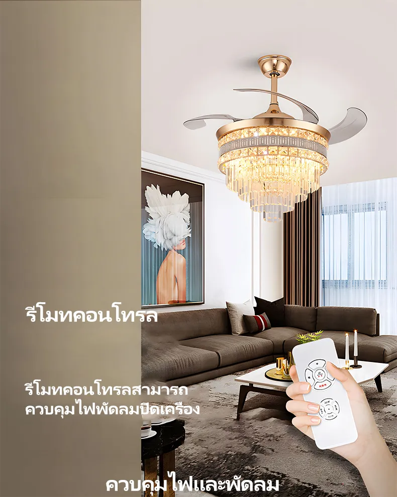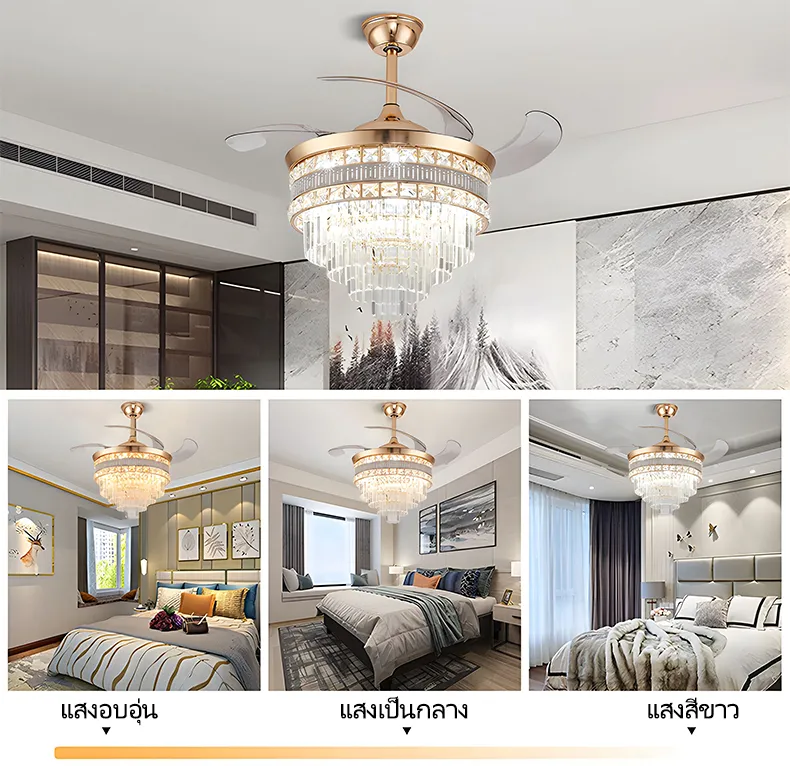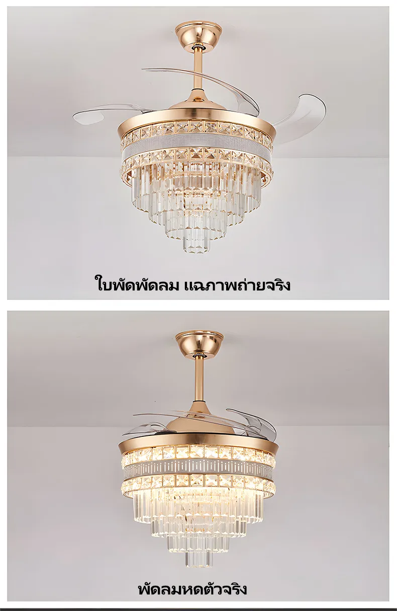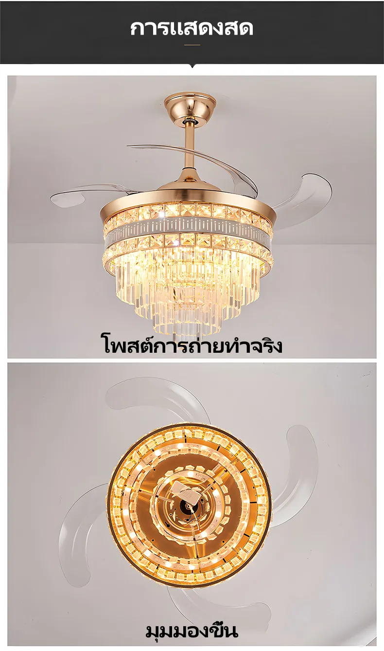 GEJIESE โคมไฟเพดาน พัดลมโคมไฟ โคมไฟพัดลมเพดาน พัดลมเพดาน พัดลมติดเพดาน โคมไฟคริสตัล เปลี่ยนสีไฟได้3สี มีรีโมทควบคุม ไฟพัดลมอัจฉริยะLED ไฟระย้า