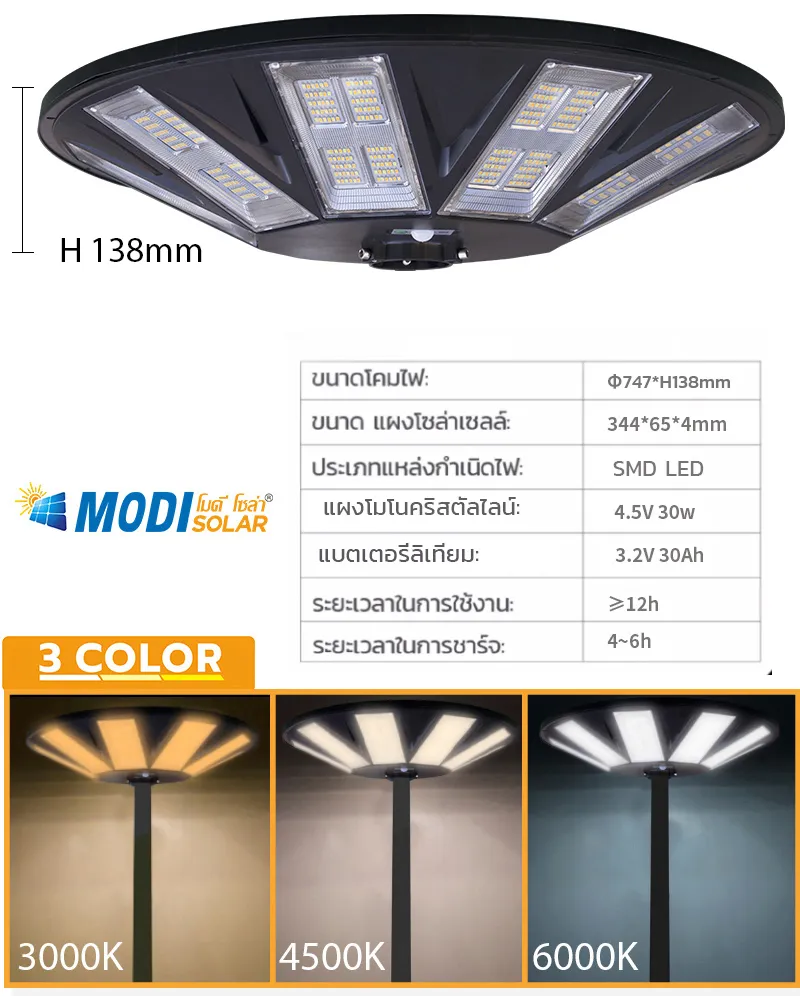 - *อุณภูมิของสี(แสงไฟ):6500K/4500K/3000K แสงขาว/คูลไวท์/เหลือง