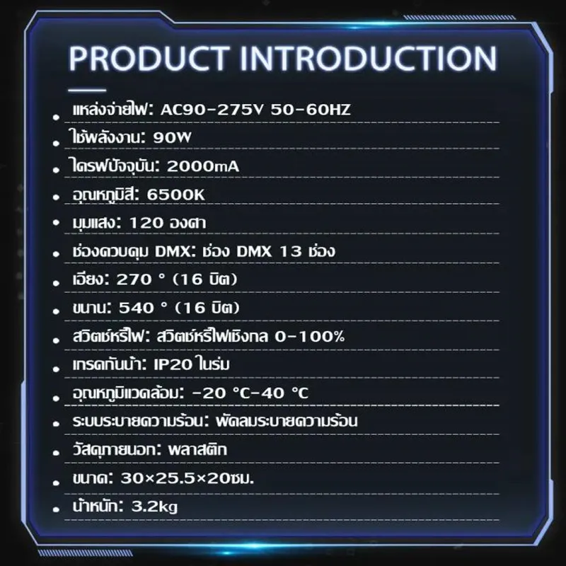• การใช้พลังงาน: 90W(LED 6X15W; เลเซอร์50MW)
