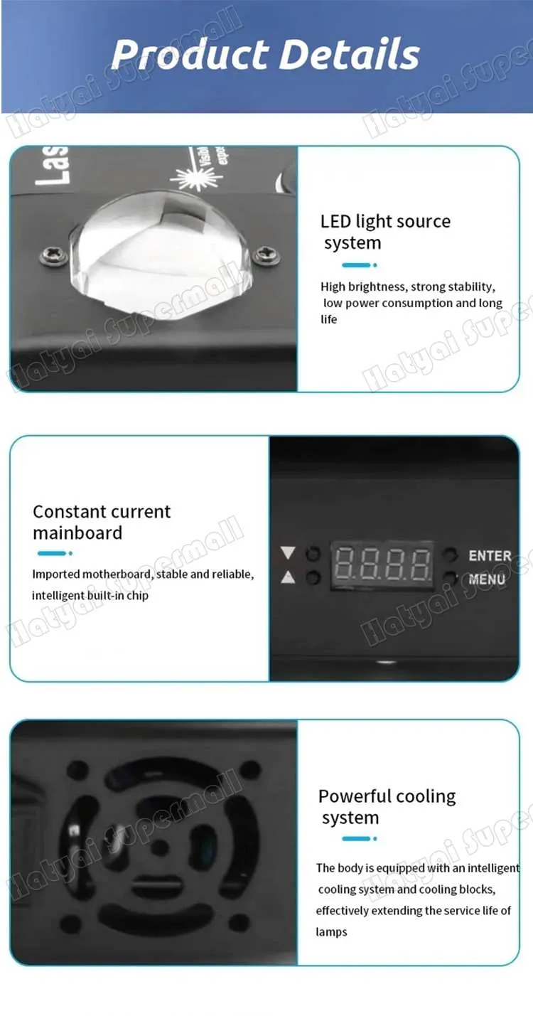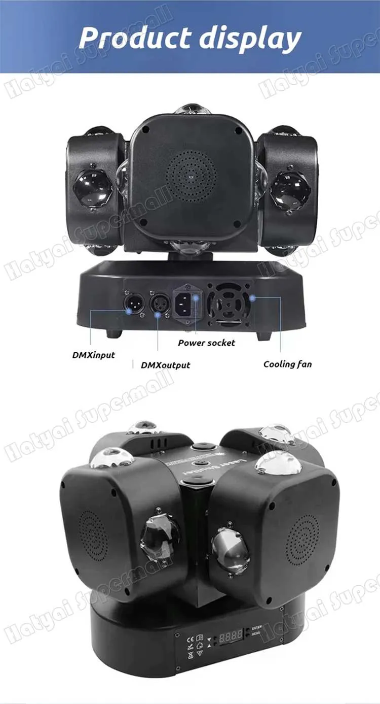 ● Lamp granule parameters: 16x10W CREE four-in a lamp beads, 2x10w white stroboscopic light, 1x100mw red laser, 1x50mw green laser