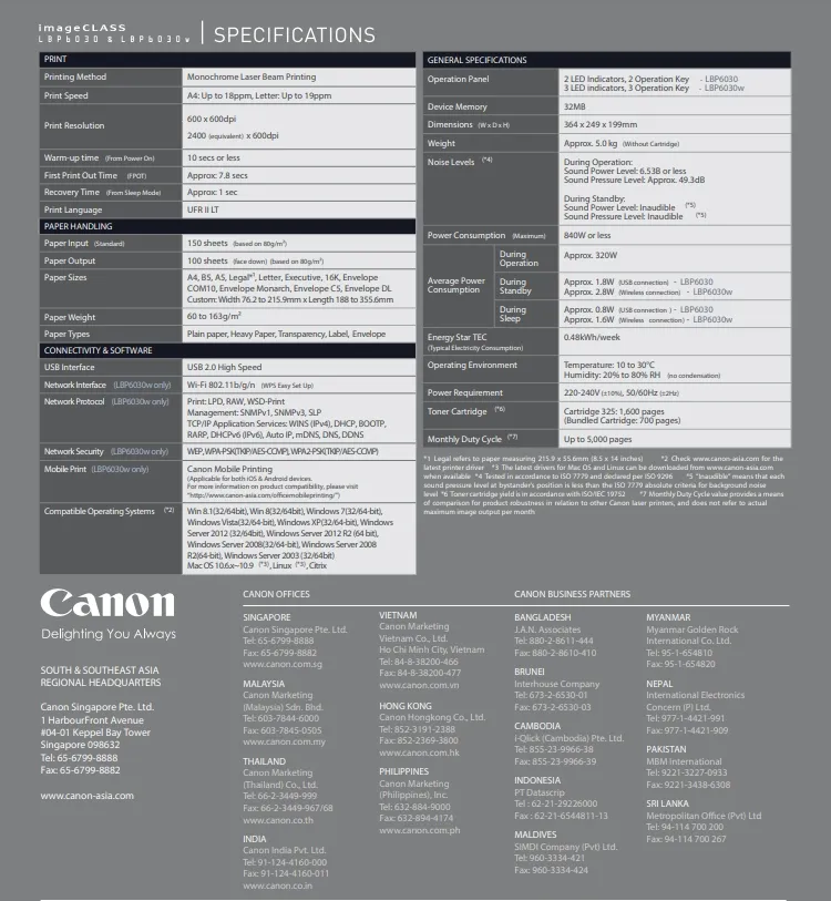 เครื่องปริ้นเตอร์เลเซอร์ ขาว-ดำ Canon Image Class LBP6030 หน่วยความจำ 32 MB ความละเอียดในการพิมพ์ 2400×600 dpi ความเร็วในการพิมพ์ (A4) 18 หน้าต่อนาที มาพร้อมฟังก์ชั่นการใช้งาน Sleep mode และ Auto Shutdown เมื่อไม่ใช้งาน ช่วยให้ประหยัดพลังงานไฟฟ้า ขนาดเล็กกะทัดรัด ประหยัดเนื้อที่ตั้งวาง