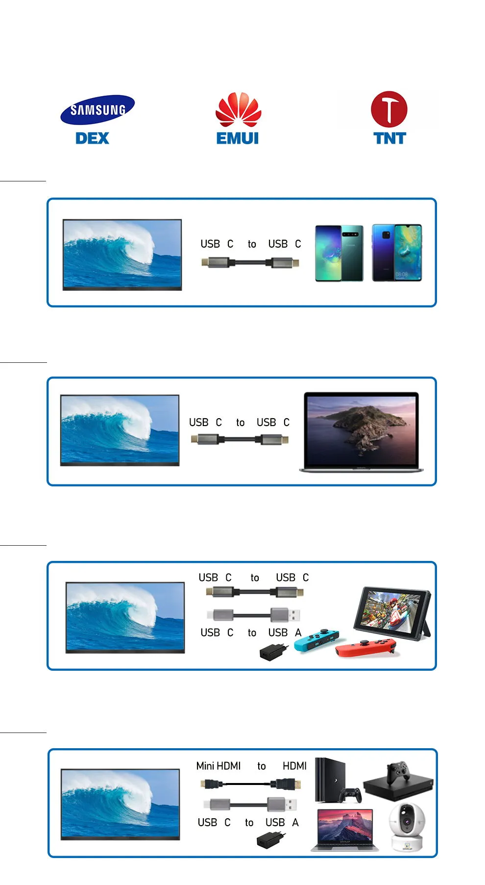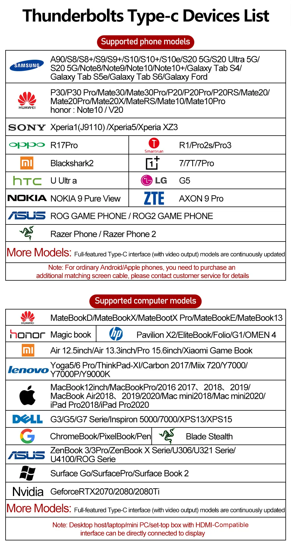 สำหรับโทรศัพท์ที่มีพอร์ต Type-C ที่ทำงานได้อย่างสมบูรณ์เท่านั้น (สำหรับ iPhone จำเป็นต้องใช้อะแดปเตอร์ Lightning to HDTV)