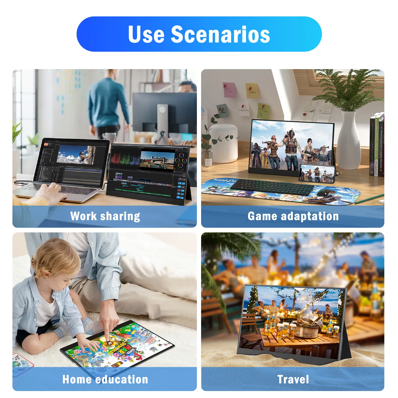 FHD 1080P PORTABLE Touch Screen – BEEX ใช้หน้าจอ IPS ขั้นสูงขนาด 15.6 นิ้วพร้อมมุมมองภาพกว้าง 178° มอบคุณภาพการรับชมอันน่าทึ่ง 1920*1080 และเทคโนโลยี HDR จอภาพเกมแบบพกพามีความสามารถในการแสดงสีที่ยอดเยี่ยม ให้ความชัดเจนยิ่งขึ้น ราบรื่น ประสิทธิภาพที่ยอดเยี่ยมในการเล่นเกม/มัลติมีเดีย สามารถลดความเสียหายจากรังสีของแสงสีฟ้าได้อย่างมีประสิทธิภาพ ไม่กะพริบ ถนอมสายตา และทำให้รับชมได้นานขึ้น