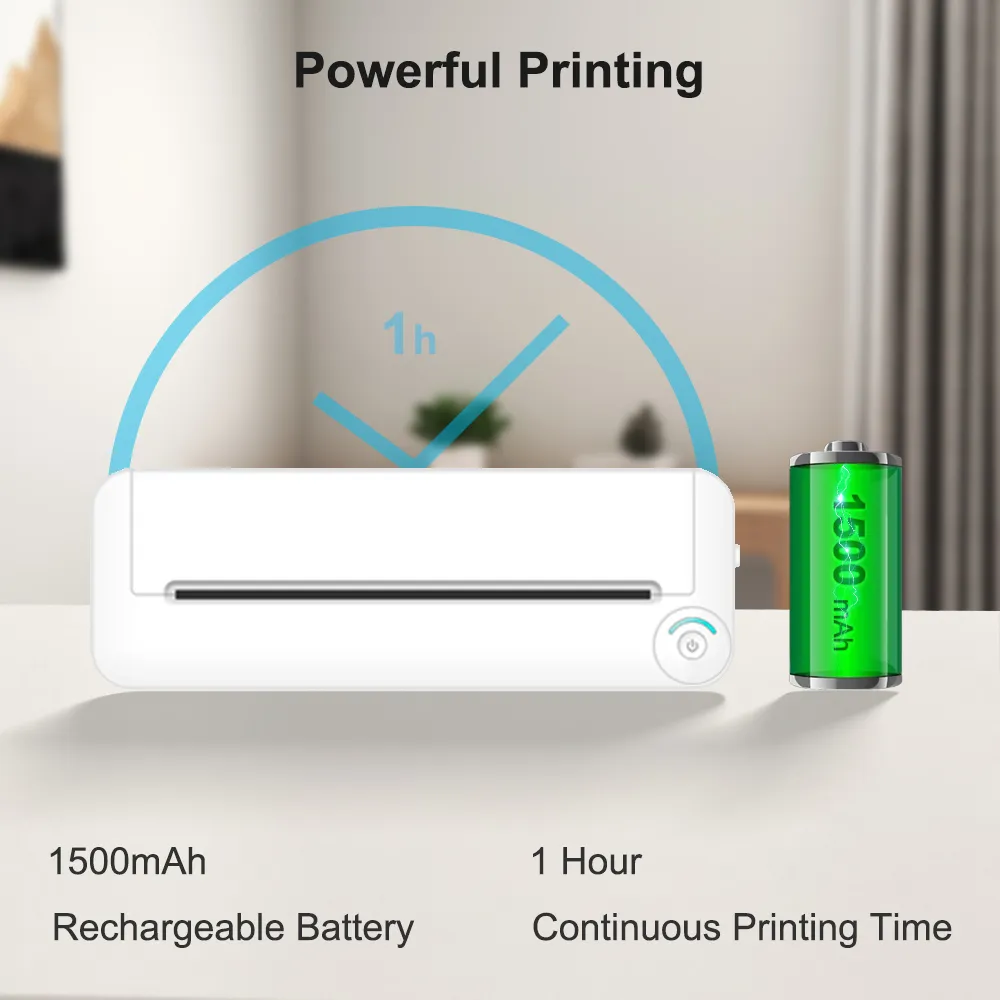 - ทรงพลังและทนทาน: แบตเตอรี่ลิเธียมความจุสูงในตัว 1500mAh สามารถพิมพ์กระดาษ A4 ได้ 200 แผ่นหลังจากชาร์จเต็ม ม้วนกระดาษแต่ละม้วนสามารถพิมพ์ A4 ได้ 45 แผ่น ไม่จำเป็นต้องเปลี่ยนบ่อย
