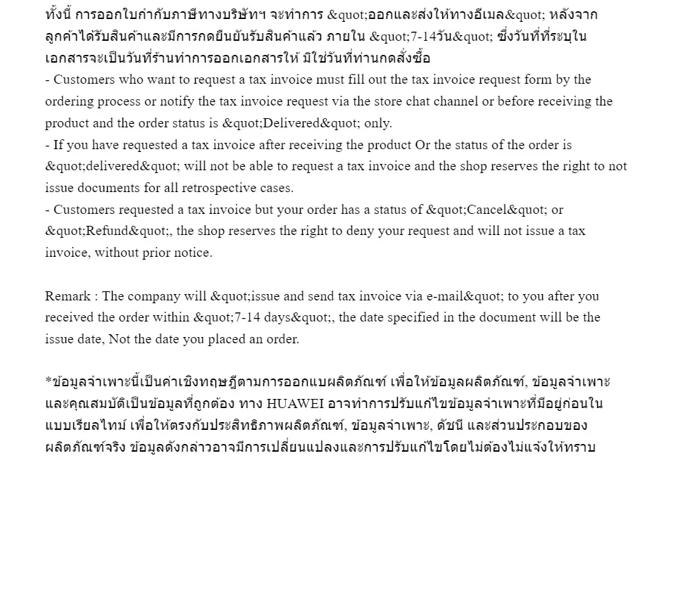 - ทั้งนี้ การออกใบกำกับภาษีทางบริษัทฯ จะทำการ “ออกและส่งให้ทางอีเมล” หลังจากลูกค้าได้รับสินค้าและมีการกดยืนยันรับสินค้าแล้ว ภายใน “7-14วัน” ซึ่งวันที่ที่ระบุในเอกสารจะเป็นวันที่ร้านทำการออกเอกสารให้ มิใช่วันที่ท่านกดสั่งซื้อ