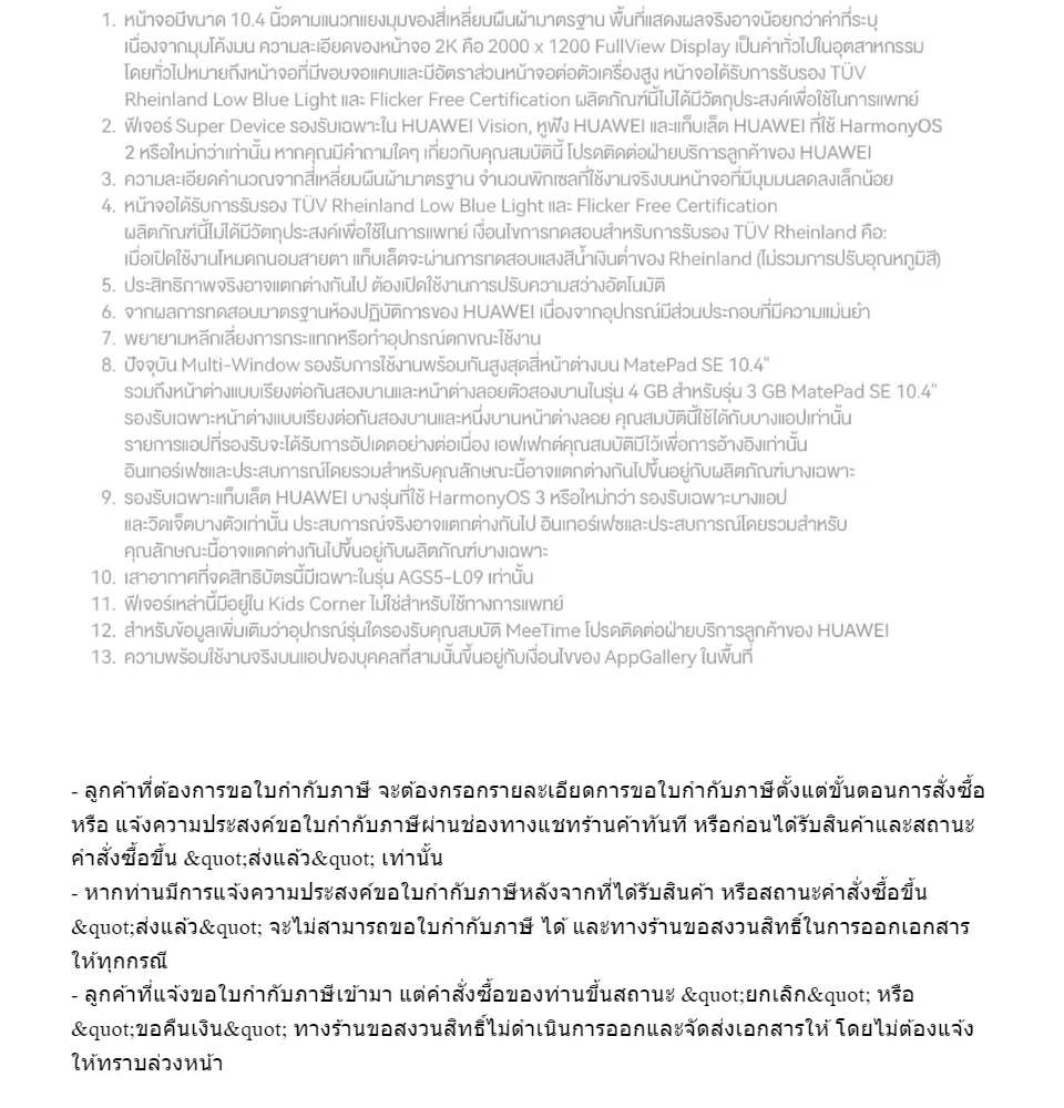 - *ข้อมูลจำเพาะนี้เป็นค่าเชิงทฤษฎีตามการออกแบผลิตภัณฑ์ เพื่อให้ข้อมูลผลิตภัณฑ์, ข้อมูลจำเพาะ และคุณสมบัติเป็นข้อมูลที่ถูกต้อง ทาง HUAWEI อาจทำการปรับแก้ไขข้อมูลจำเพาะที่มีอยู่ก่อนในแบบเรียลไทม์ เพื่อให้ตรงกับประสิทธิภาพผลิตภัณฑ์, ข้อมูลจำเพาะ, ดัชนี และส่วนประกอบของผลิตภัณฑ์จริง ข้อมูลดังกล่าวอาจมีการเปลี่ยนแปลงและการปรับแก้ไขโดยไม่ต้องไม่แจ้งให้ทราบ