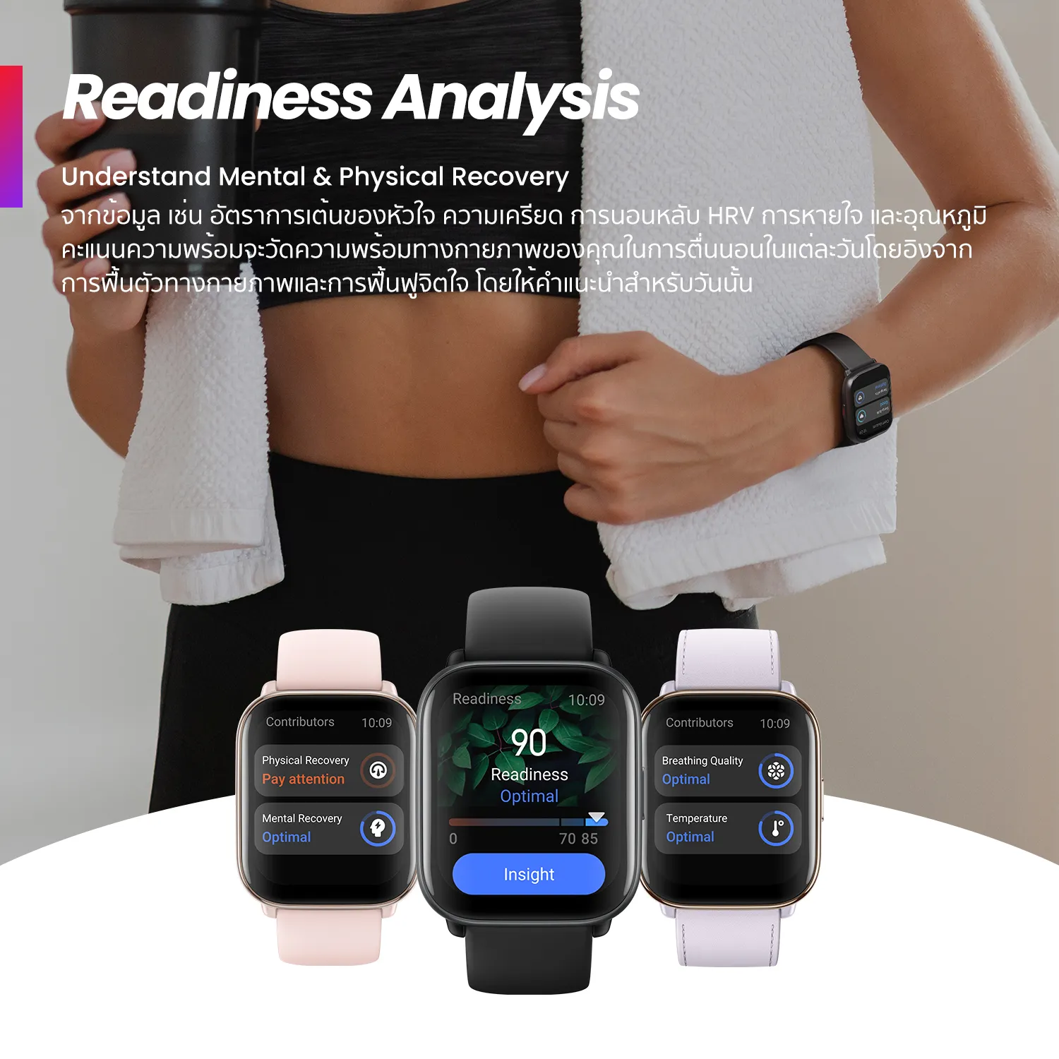 READINESS SCORE – ประมวลผลและวิเคราะห์จากข้อมูล เช่น อัตราการเต้นของหัวใจ ความเครียด การนอนหลับ HRV การหายใจ และอุณหภูมิ คะแนนความพร้อมนี้ วัดความพร้อมทางกายภาพของคุณหลังจากตื่นนอนในแต่ละวัน โดยอิงจากการฟื้นตัวทางกายภาพและการฟื้นฟูจิตใจ โดยให้คำแนะนำสำหรับวันนั้นในการทำกิจกรรมและออกกำลังกายต่างๆ