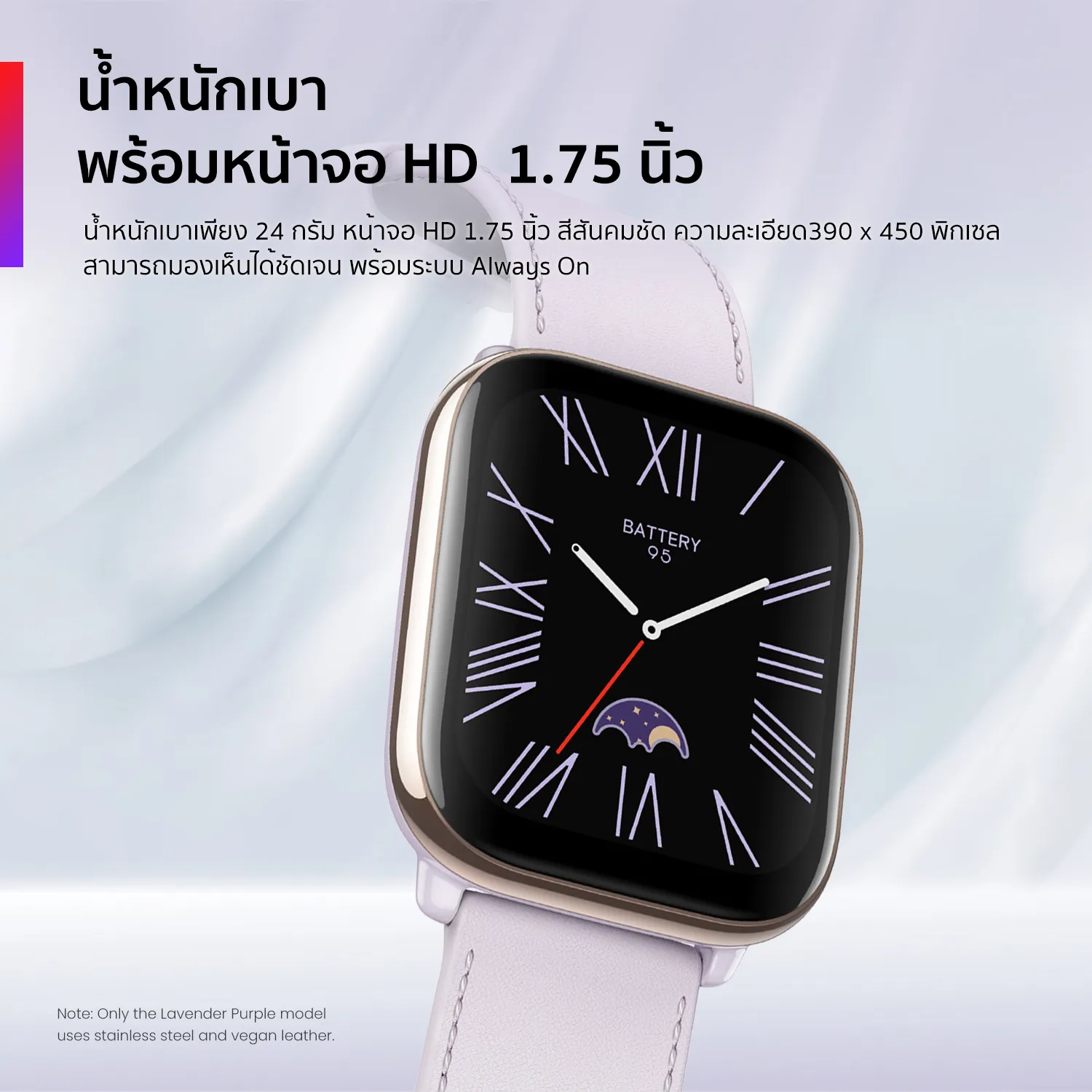 น้ำหนักเบา พร้อมหน้าจอ HD 1.75 นิ้ว – น้ำหนักเบาเพียง 24 กรัม พร้อมหน้าจอ HD 1.75 นิ้ว สีสันคมชัด ความละเอียด 390 x 450 พิกเซล 341 ppi สามารถมองเห็นได้ชัดเจน พร้อมระบบ Always On