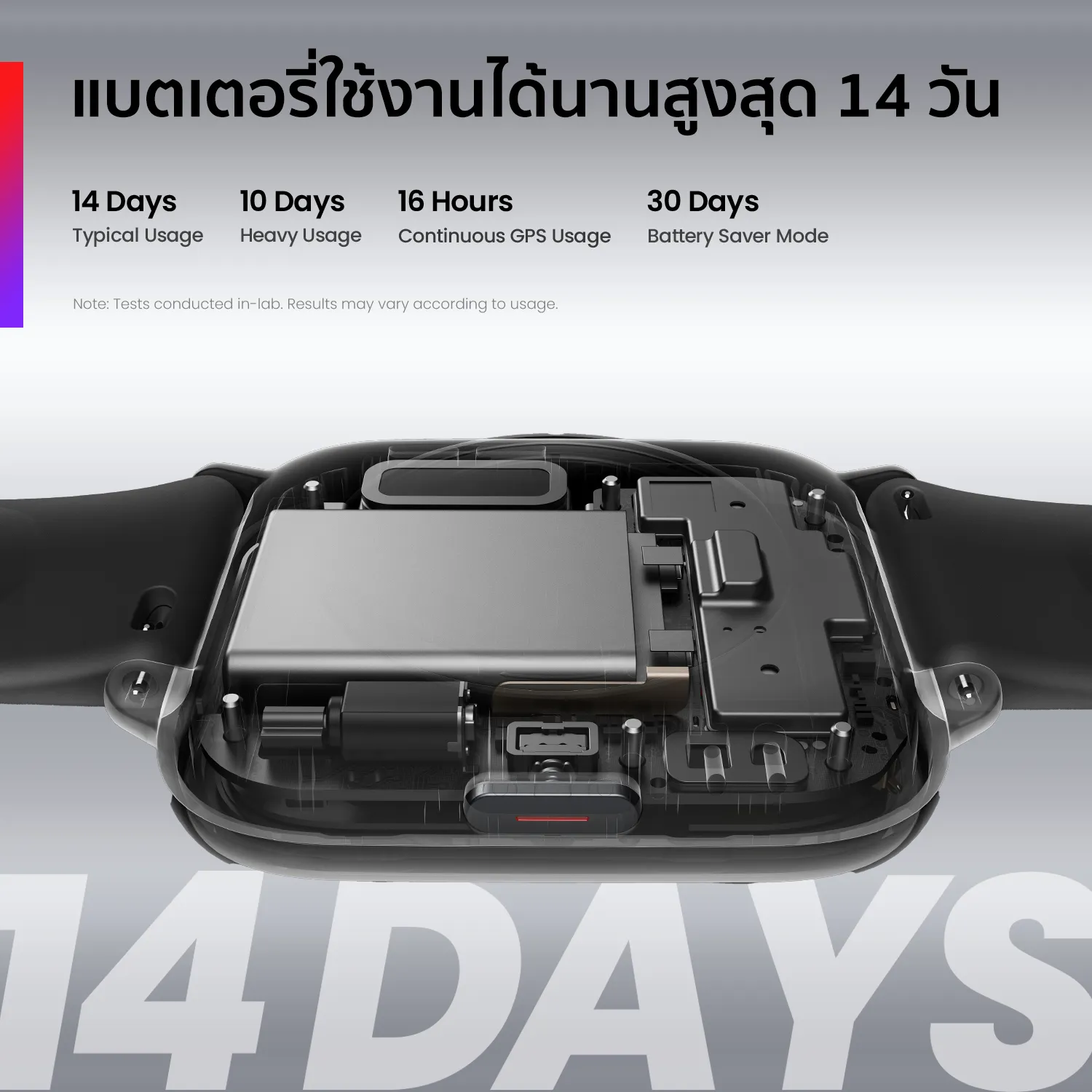 แบตเตอรี่ใช้งานได้นานสูงสุด 14 วัน – สามารถใช้งานได้สูงสุด 14 วัน (การใช้งานในโหมดปกติ) นอกจากนี้ยังใช้งานได้ 30 วันในโหมดประหยัดแบตเตอรี่ ไม่ต้องกังวลเรื่องการชาร์จบ่อยๆ อีกต่อไป