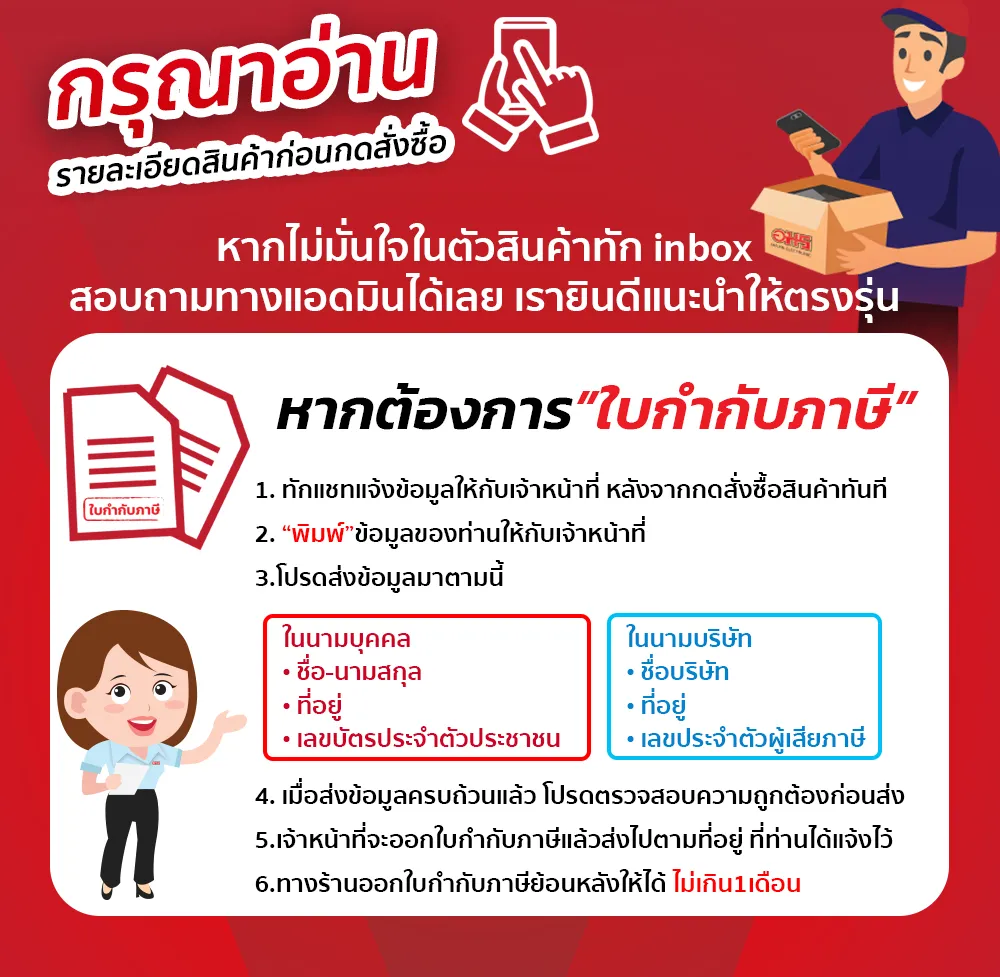 *โปรดเก็บกล่อง,ใบรับประกัน,อุปกรณ์ภายในกล่องมาให้ครบ หากลูกค้าต้องการเคลมสินค้าเมื่อสินค้ามีปัญหา