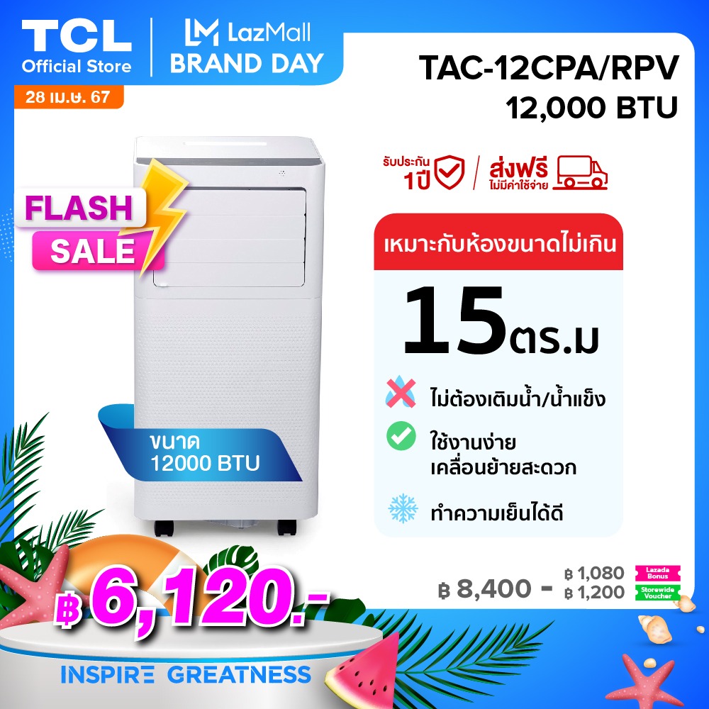 - TCL แอร์เคลื่อนที่ขนาด 12000 BTU ใช้งานง่ายเคลื่อนย้ายได้สะดวก สามารถทำความเย็นได้ดี เหมาะกับห้องขนาดไม่เกิน 15 ตารางเมตร