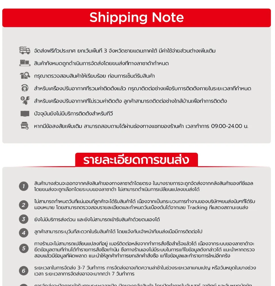 - หมายเหตุ : โปรดรักษาสิทธิ์ของท่านในการรับสินค้า เนื่องจากสินค้าในกลุ่มเครื่องใช้ไฟฟ้ามีราคาสูง หากท่านไม่ได้ถ่ายคลิปขณะแกะสินค้าเพื่อยืนยันความเสียหาย ถือว่าท่านได้ยอมรับสินค้านั้นแล้ว โดยที่ท่านจะไม่สามารถแจ้งคืนสินค้า, แจ้งเคลม หรือเรียกร้องความเสียหายใดๆได้