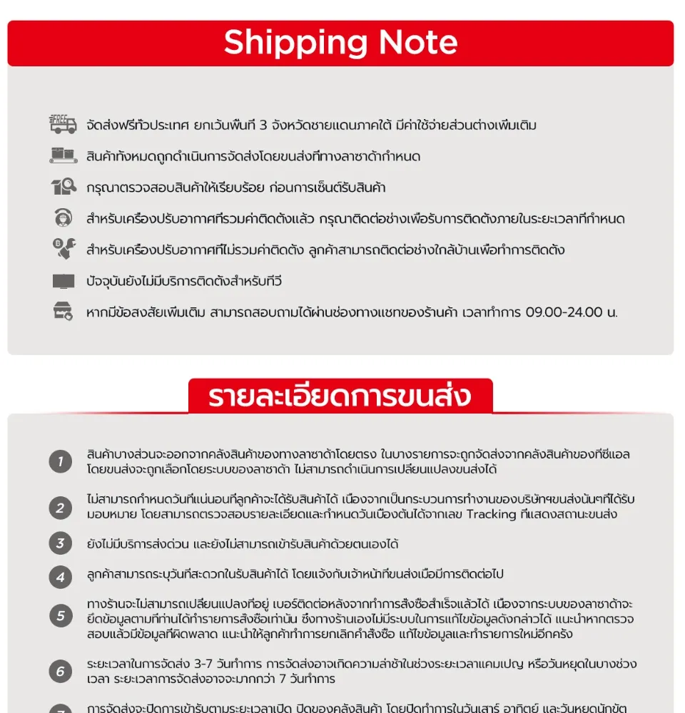 • หมายเหตุ : โปรดรักษาสิทธิ์ของท่านในการรับสินค้า เนื่องจากสินค้าในกลุ่มเครื่องใช้ไฟฟ้ามีราคาสูง หากท่านไม่ได้ถ่ายคลิปขณะแกะสินค้าเพื่อยืนยันความเสียหาย ถือว่าท่านได้ยอมรับสินค้านั้นแล้ว โดยที่ท่านจะไม่สามารถแจ้งคืนสินค้า, แจ้งเคลม หรือเรียกร้องความเสียหายใดๆได้